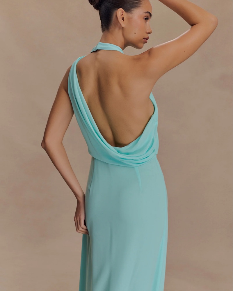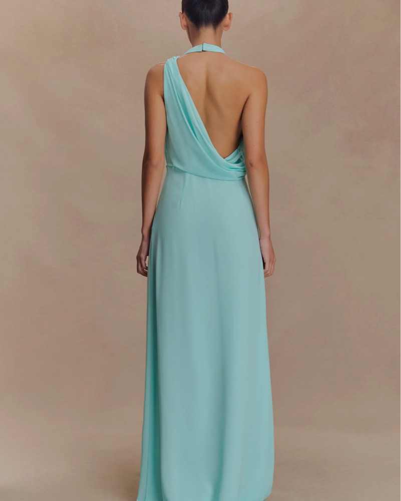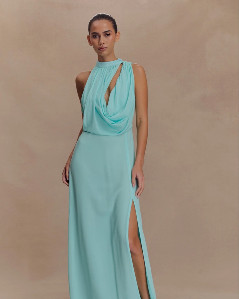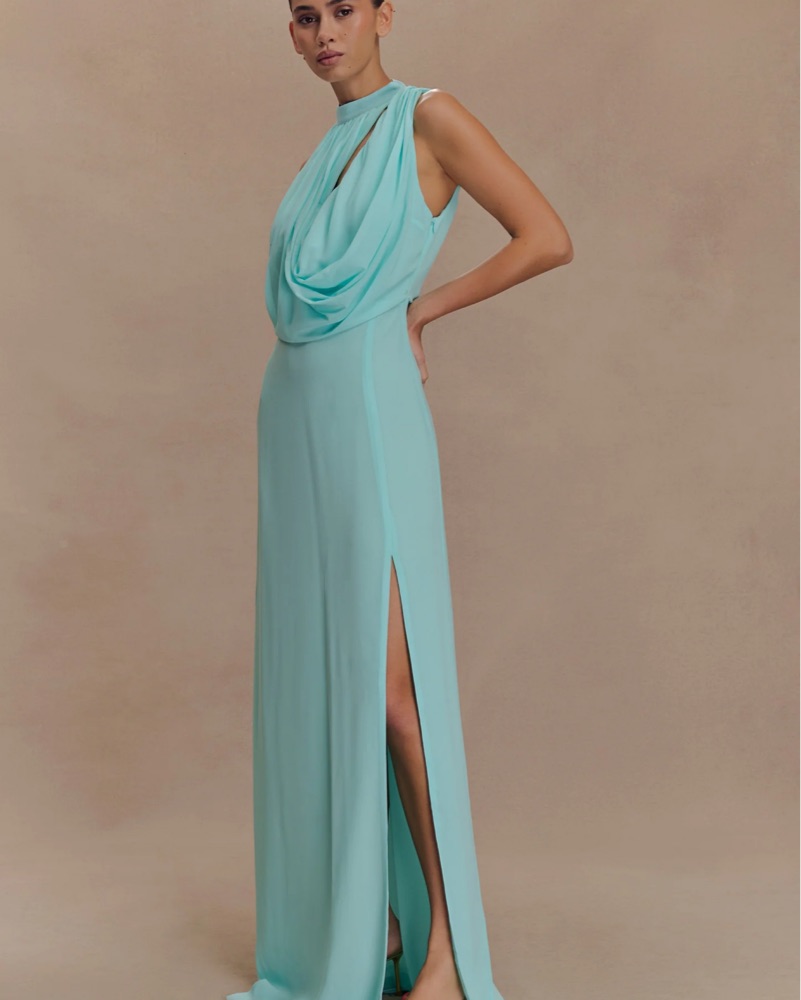 This stunning blue green dress is perfect for a formal event or special occasion. The draped halter neckline and thigh-high slit create a sophisticated and alluring look.