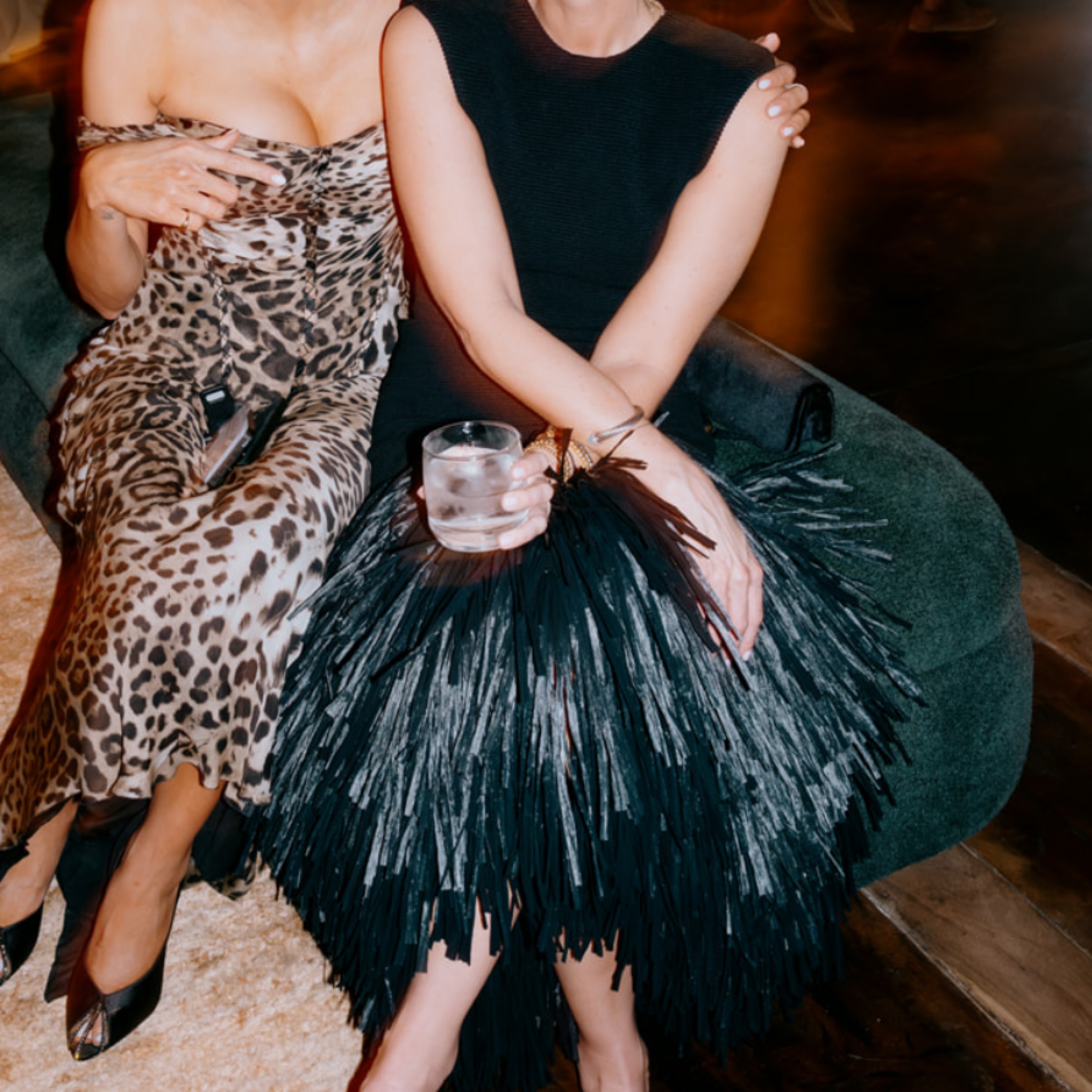 Black figure-forming, drop waist knit dress body with shoulder pads. Deep v open back with gold detail zipper. Rafia trimming