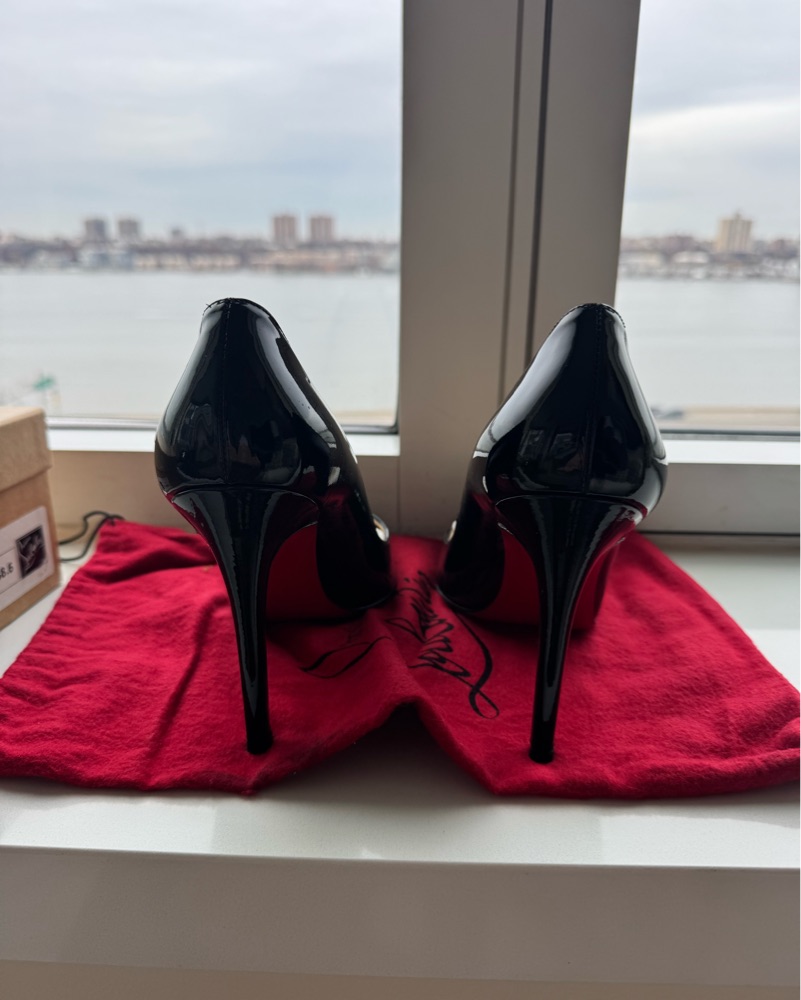 Black patent leather. Gently used, worn less than 10 times. Size 38.5 runs small