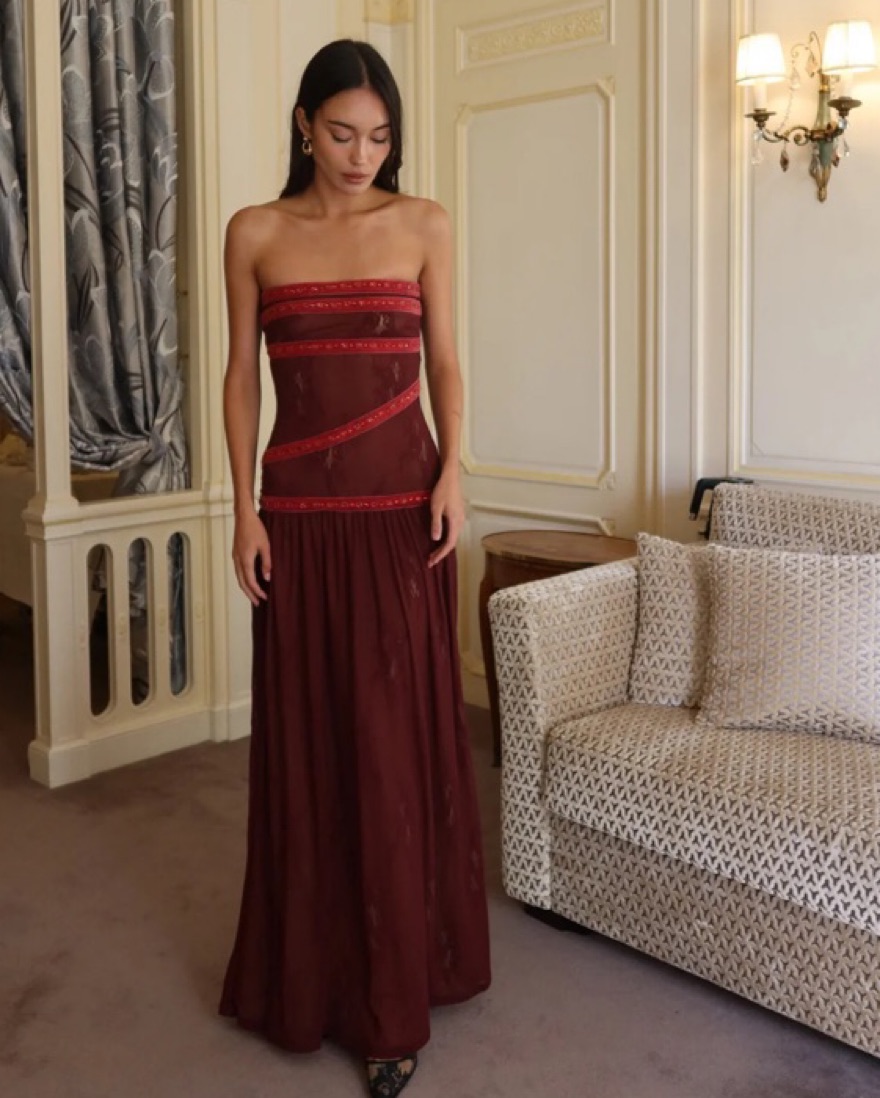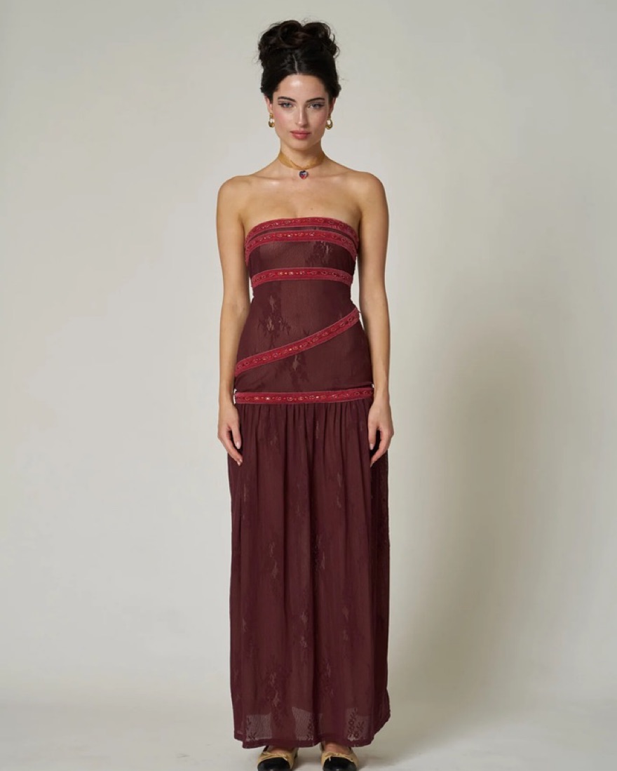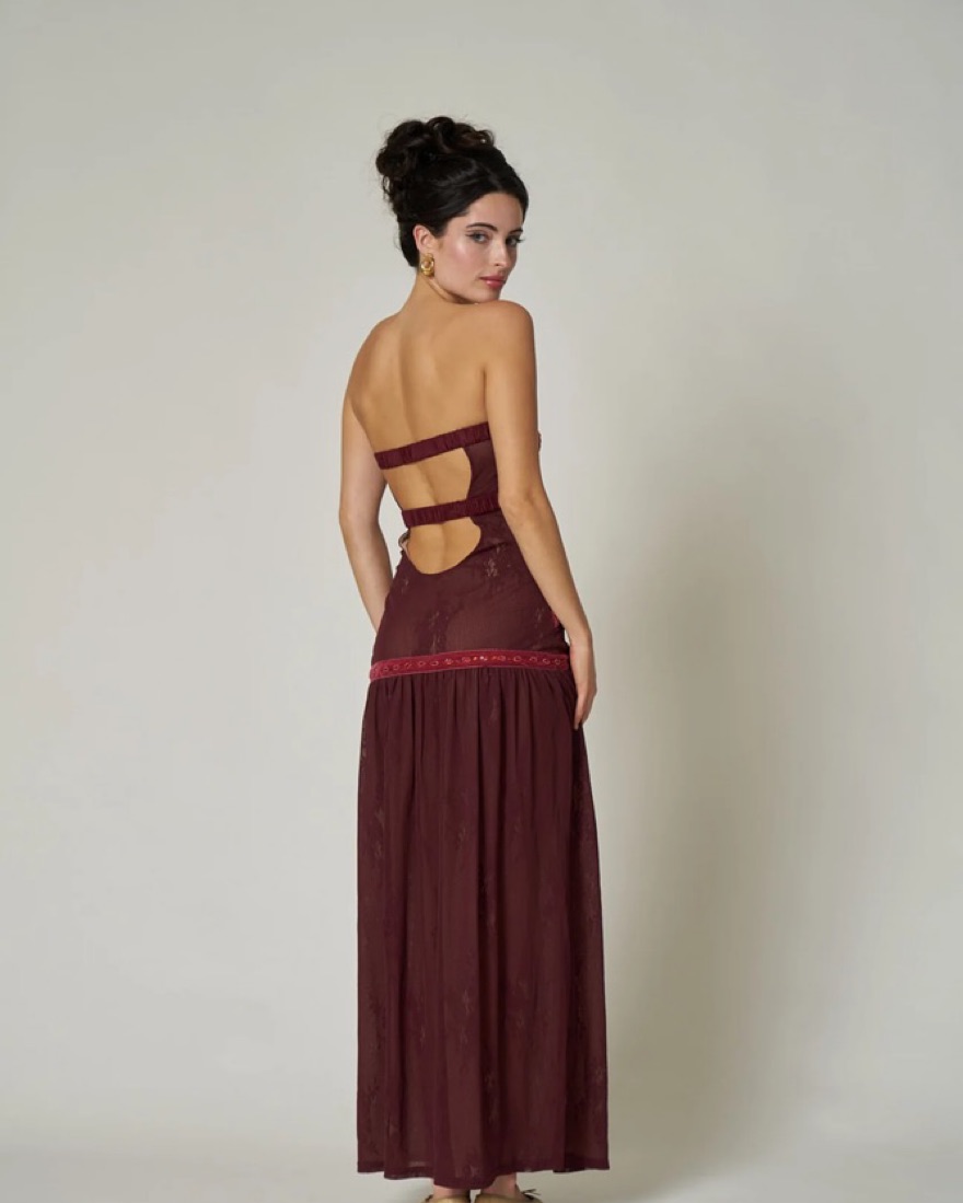 Brand new Fait Par Fouch mesh and beaded maxi length dress. Perfect for the holidays! Bordeaux style