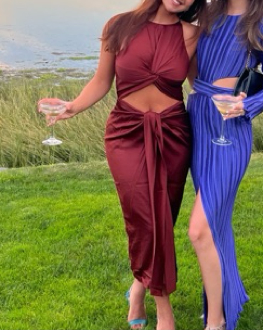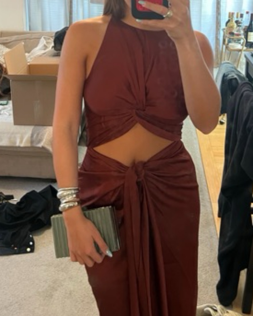 Beautiful silky dress with cut our perfect for a fall wedding. Usually a size 27 in jeans and it fit me perfectly