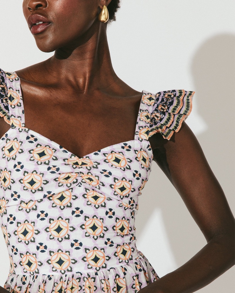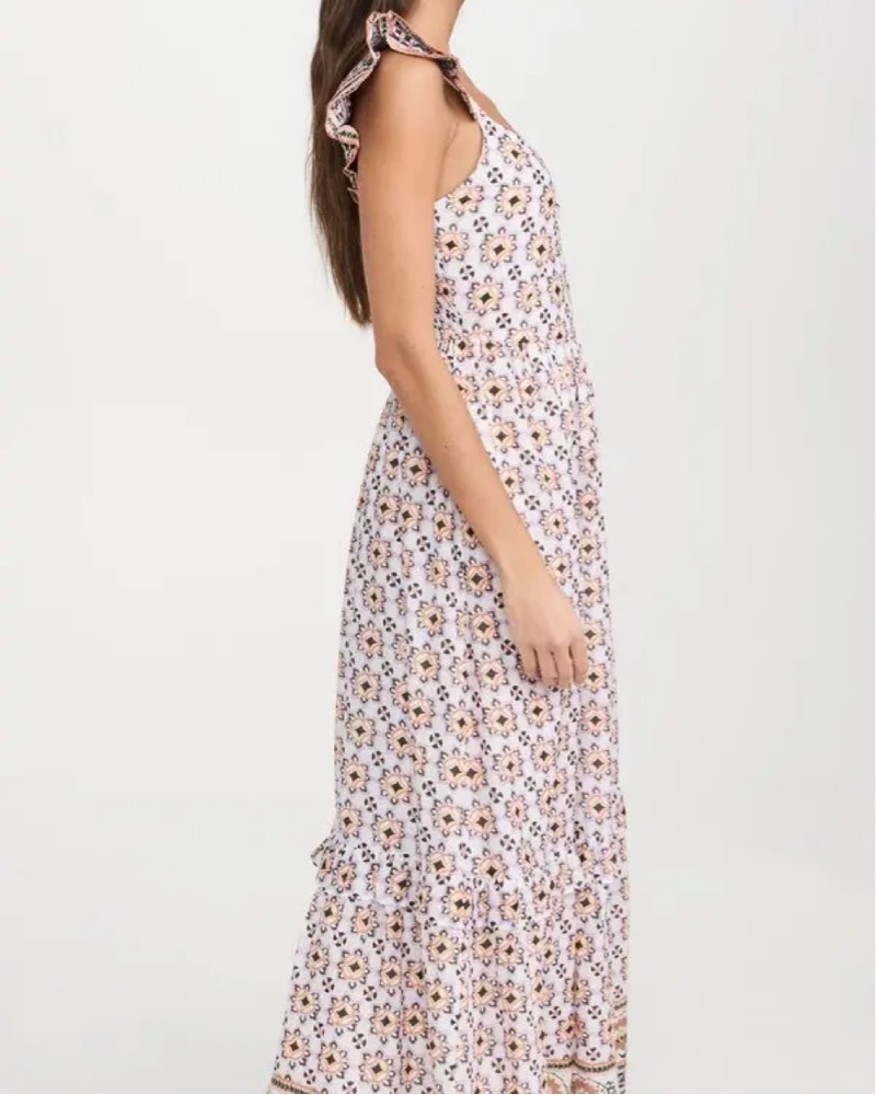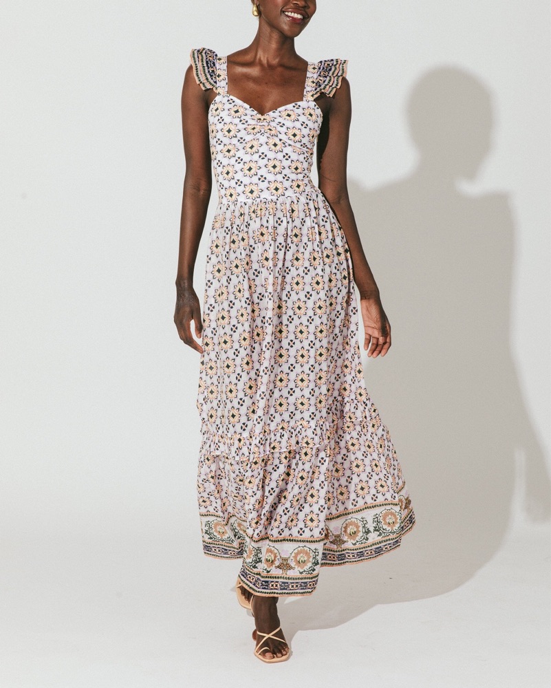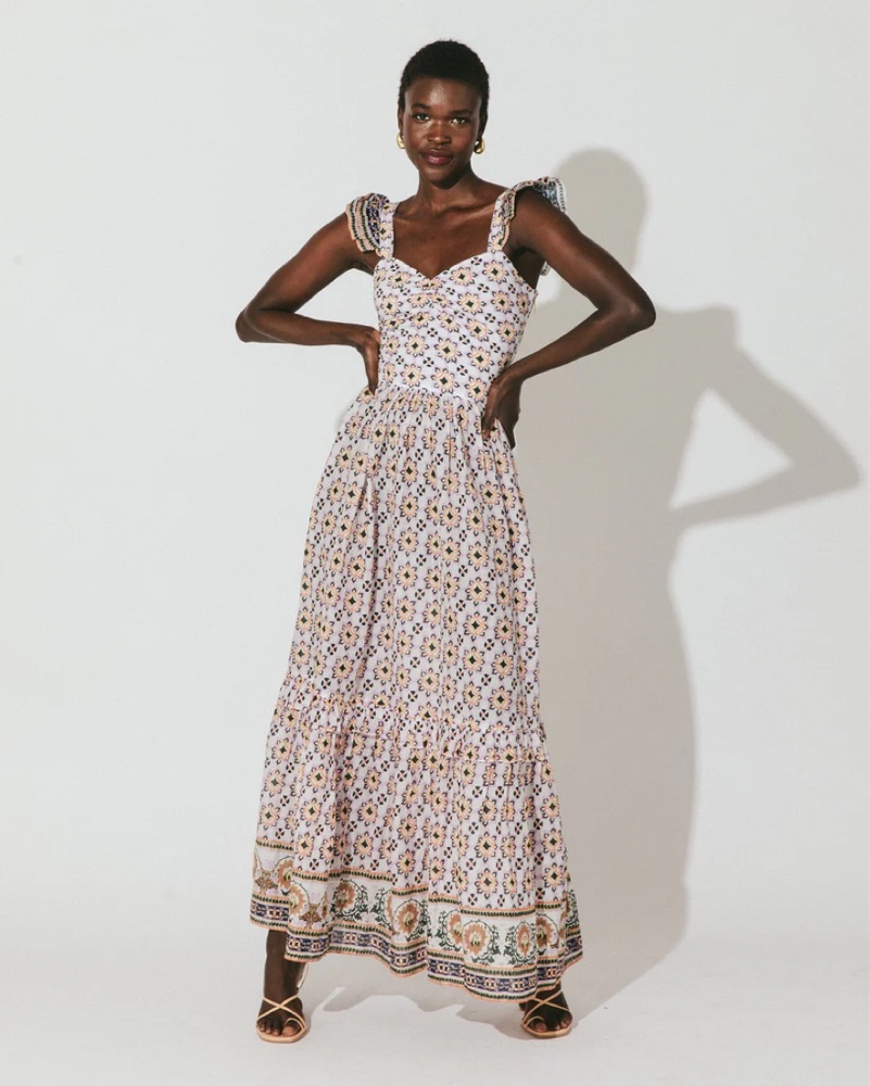 This vibrant floral maxi dress is perfect for a summer garden party or outdoor wedding. The flowing silhouette and intricate pattern create a chic and feminine look.