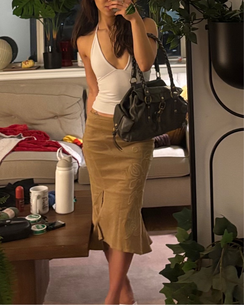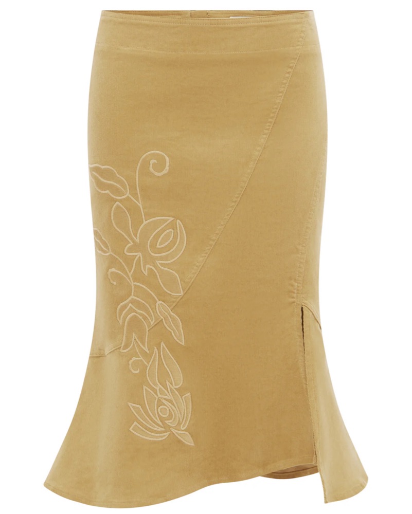 Tan corduroy mermaid skirt with embroidered detail. As seen on Charli XCX! Low rise and hits right below the knee on me! Such a cute Y2K vibe with major baddie energy! Pairs perfectly with so many tops. Brand new release from with jean. Has no stretch but runs big in the waist since it’s low rise.