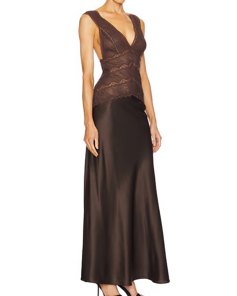 Gorgeous silk and lace dress in chocolate brown. Size S. It has been shortened to a midi length.