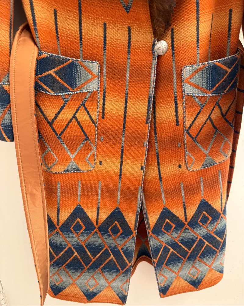 Made from Italian wool-blend jacquard. Shearling shawl collar. Wrap silhouette with a self-belt. Metal button at the front left waist. Braided piping at the placket, cuffs, pockets, and belt loops. Lined at the back yoke and the sleeves.