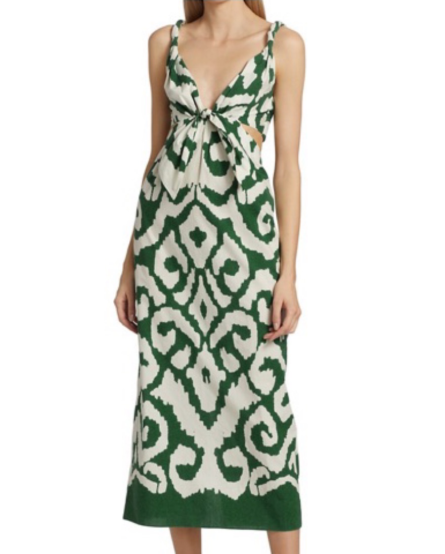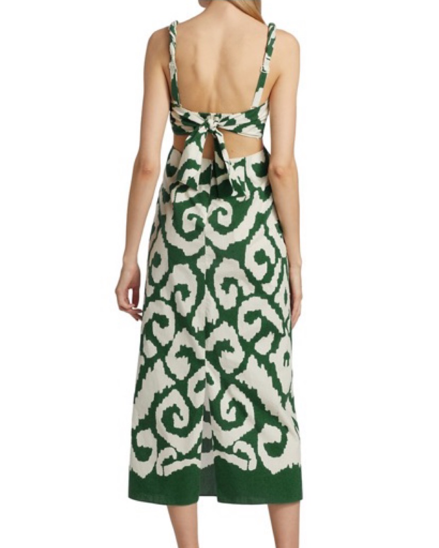 Johanna Ortiz Green Ocean Cotton Midi Dress in Ikat Deep Emerald Ecru