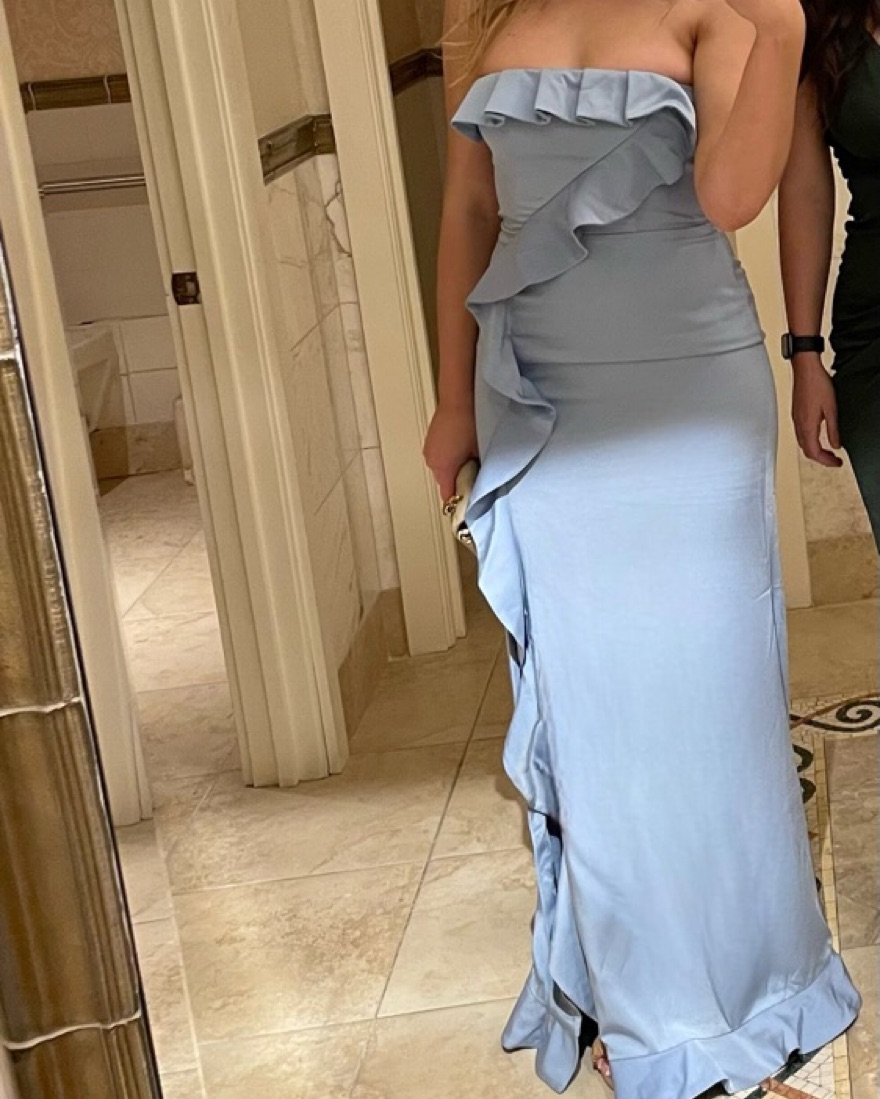 Blue ruffle gown with a leg slit