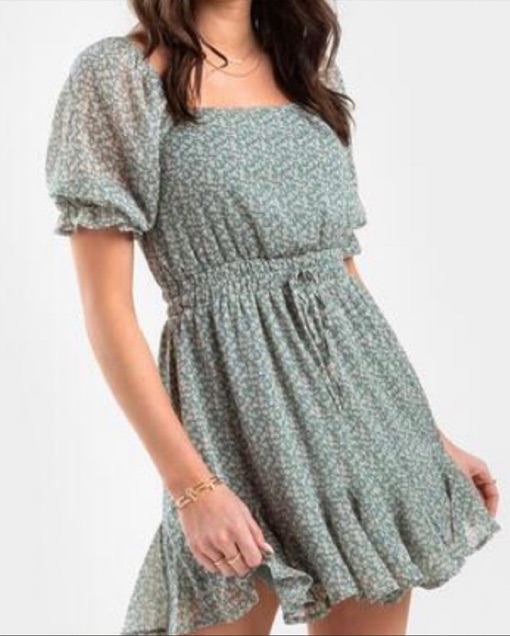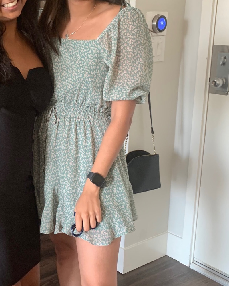 This charming floral-printed mini dress is perfect for a summer day or garden party.