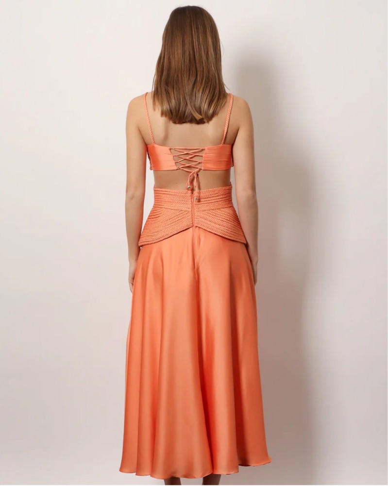 This vibrant orange midi dress is perfect for a summer date night, vacation or wedding dress. The braid crisscross detailing adds a flattering touch to waist