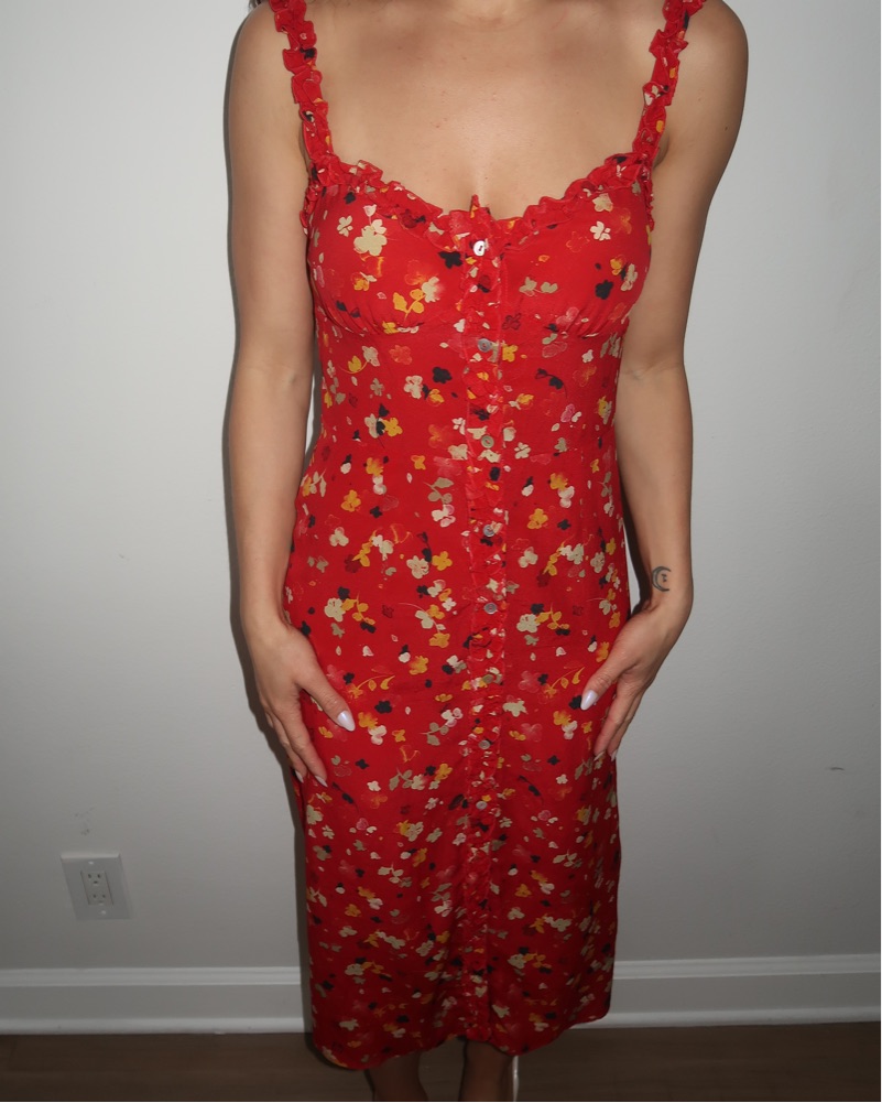 Embrace timeless elegance with the Réalisation Par Juliet Dress in Rouge Fleur. This midi-length dress features a corset-style bodice, ruffled shoulder straps, and a flattering slim A-line skirt. Perfect for garden parties, casual day outtings