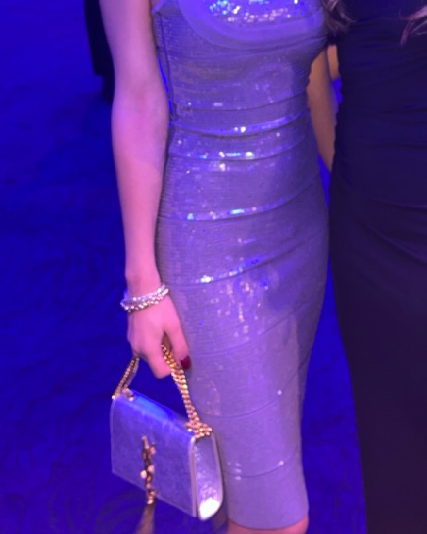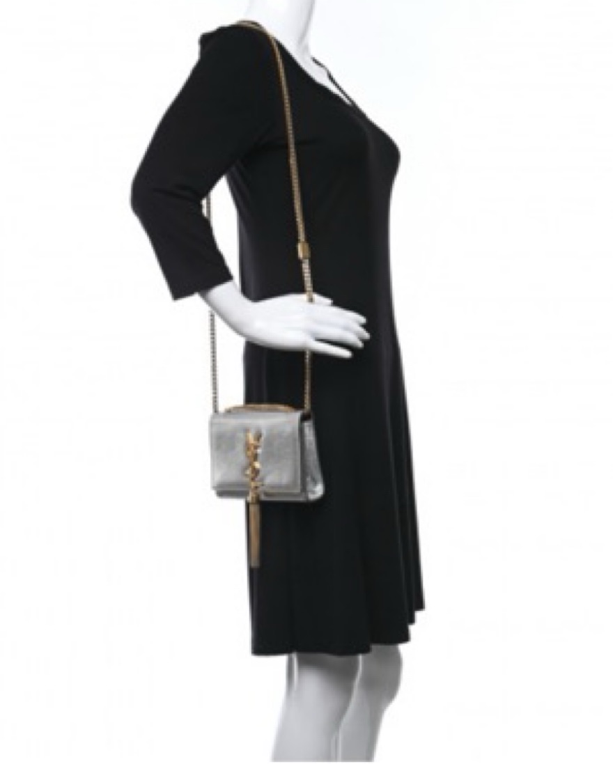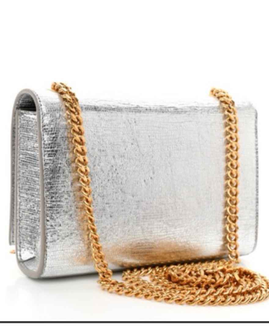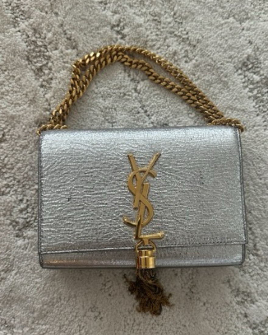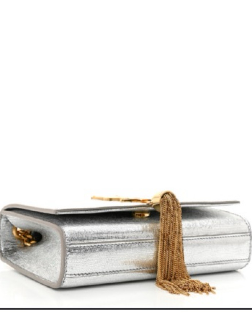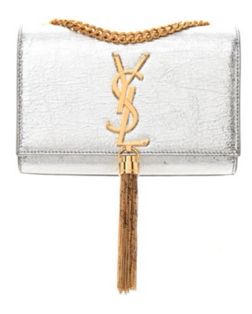 Classic Saint Laurent bag in silver with gold tassel and detailing. Perfect for elevating a night out. Can double straps for more of a handle bag look or strap can be worn long. Classic elegant chic bag that can’t go wrong!