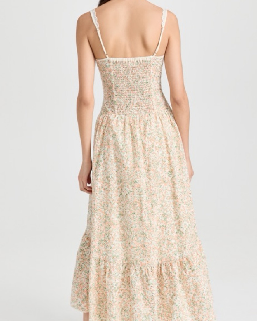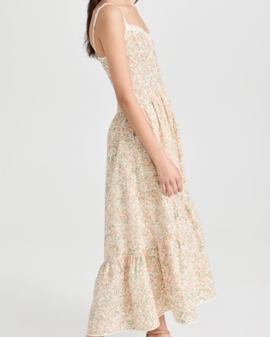 A romantic midi dress with a soft floral print, adjustable straps, and full lining for comfort. Perfect for sunny days and garden parties