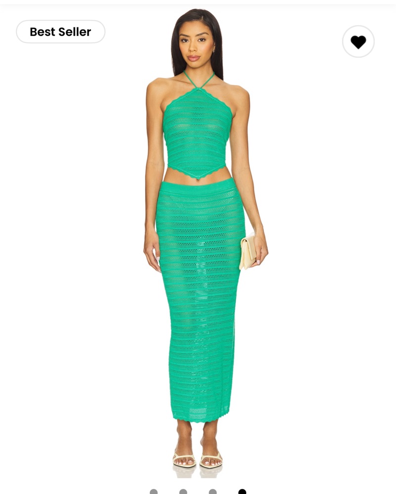 Two piece top and skirt set. Crochet material. Size small top and medium bottom, both fit like a small - I am typically small in all sizes and this fits me. Stretchy/ comfortable material.