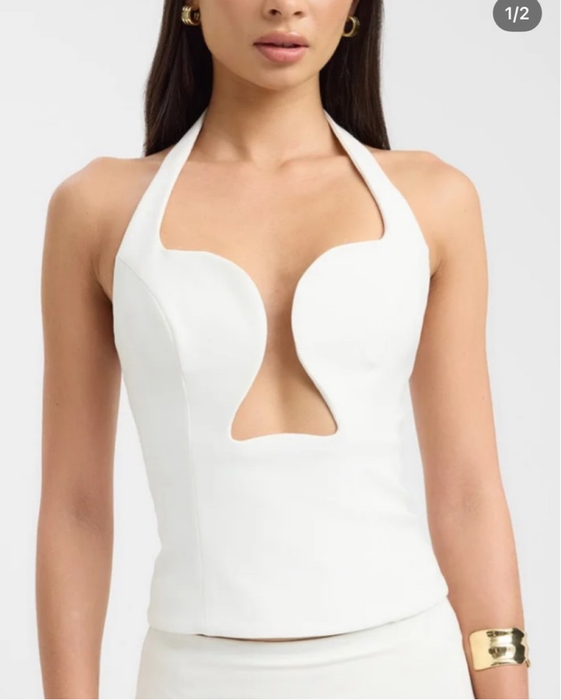 This alluring white halter top features a bold cutout design, perfect for a night out or special occasion.