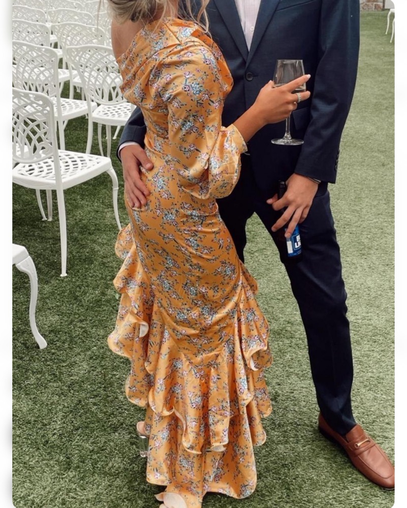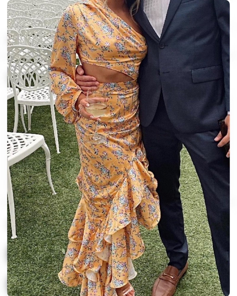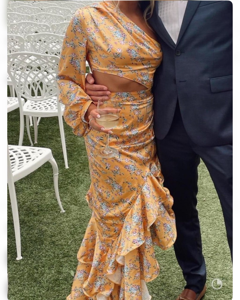 This vibrant floral maxi dress is perfect for a spring or summer wedding. The ruffled, asymmetric silhouette and bold yellow hue create a stunning, eye-catching look.