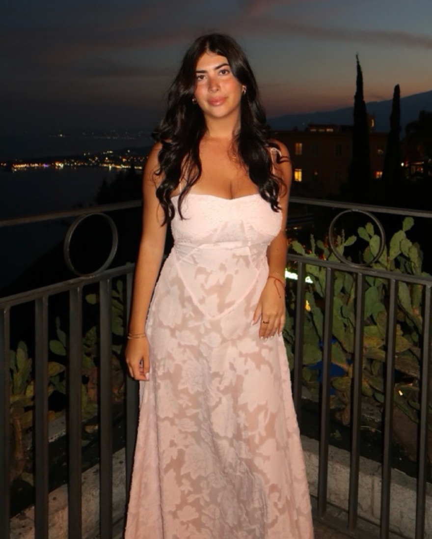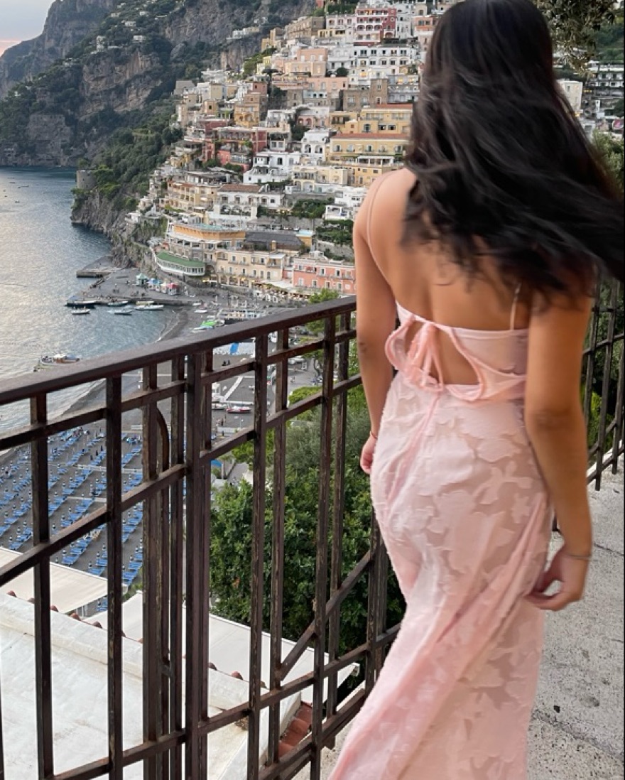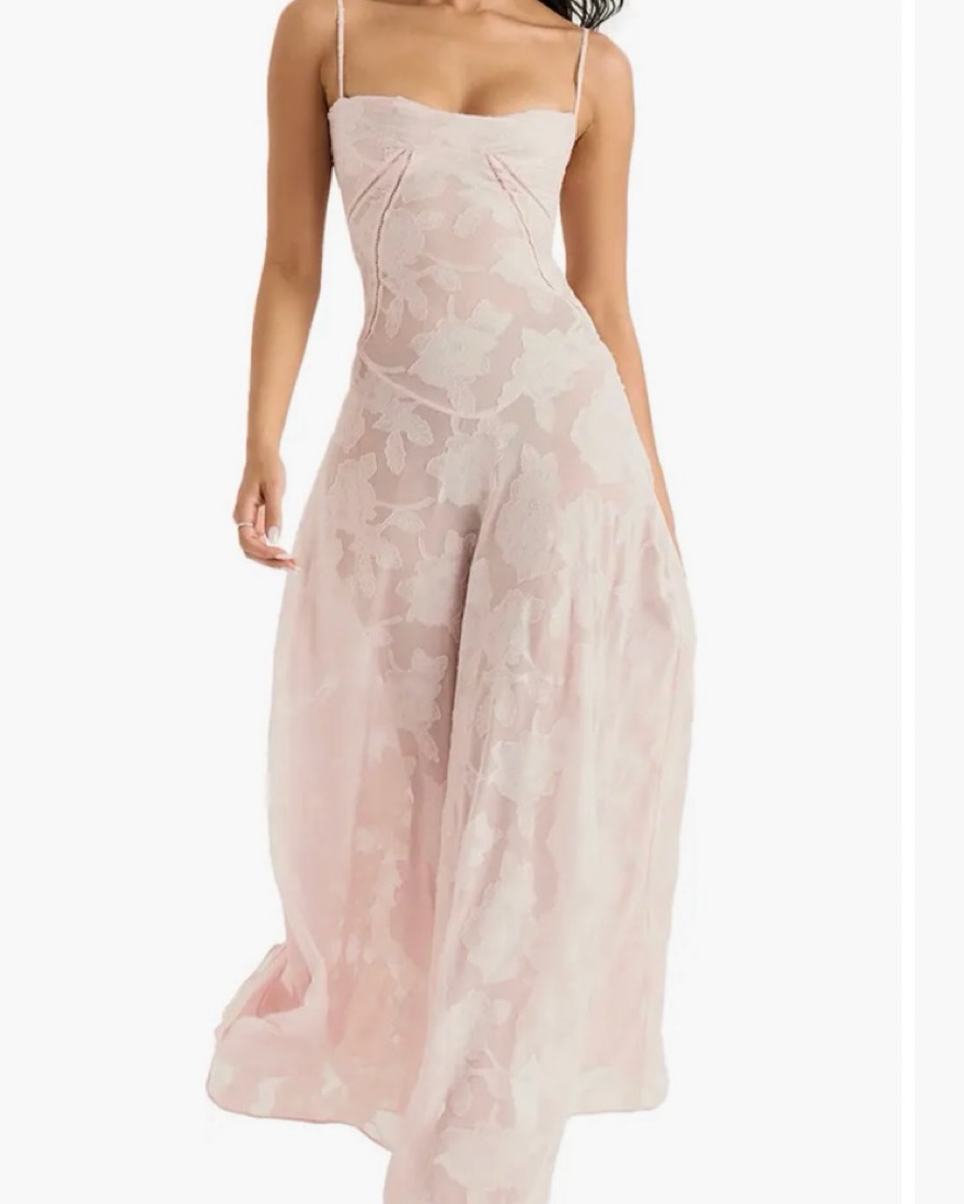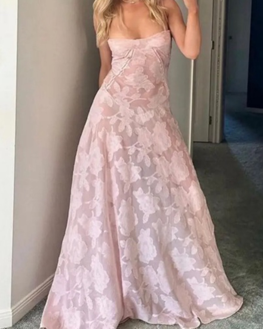 Long blush lace dress altered in the back to allow you to adjust for chest support. Dupe of House of CB Seren Gown | key words: vacation floral