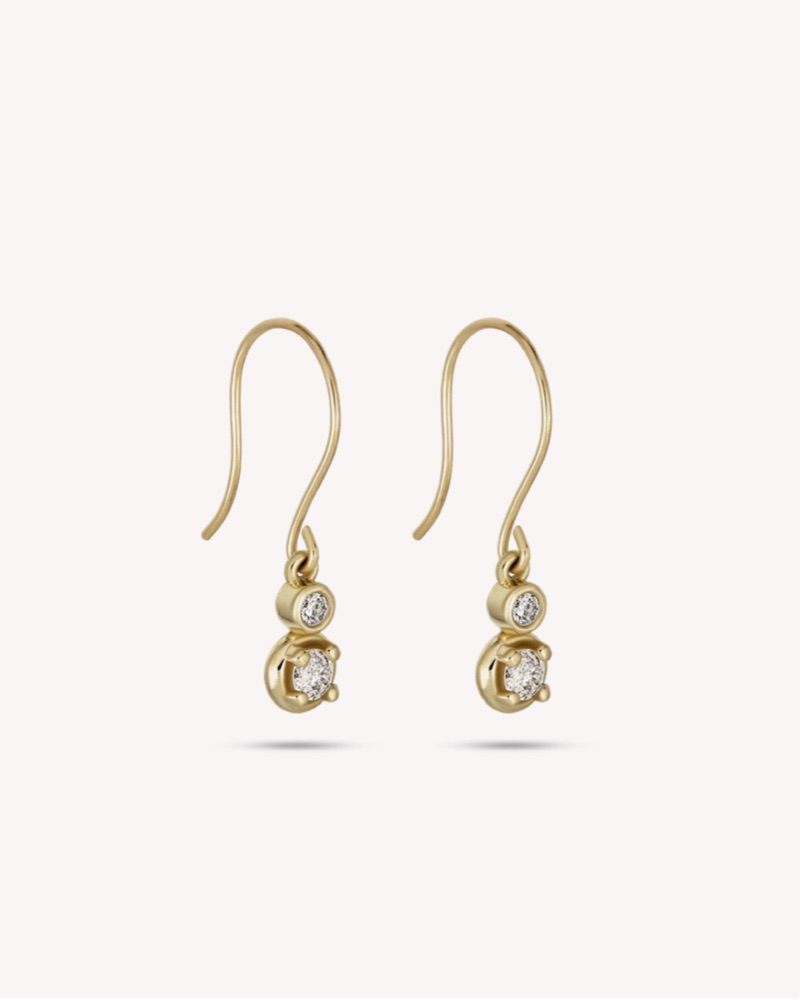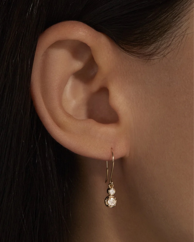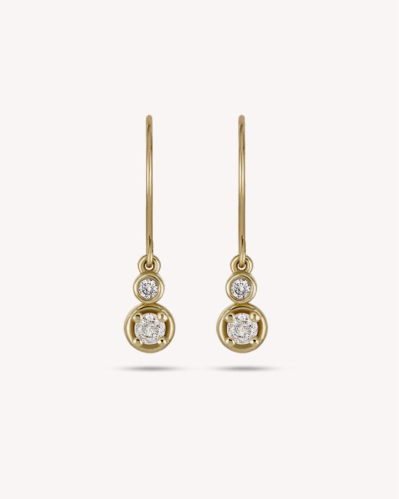 Stone and Strand Diamond Duo Bonbon Drop Earrings. 10K Solid yellow gold. Natural white diamonds: 0.22CTW per pair. Bonbon dangle: 5.6x8.3mm. Earring drop length: 25mm.