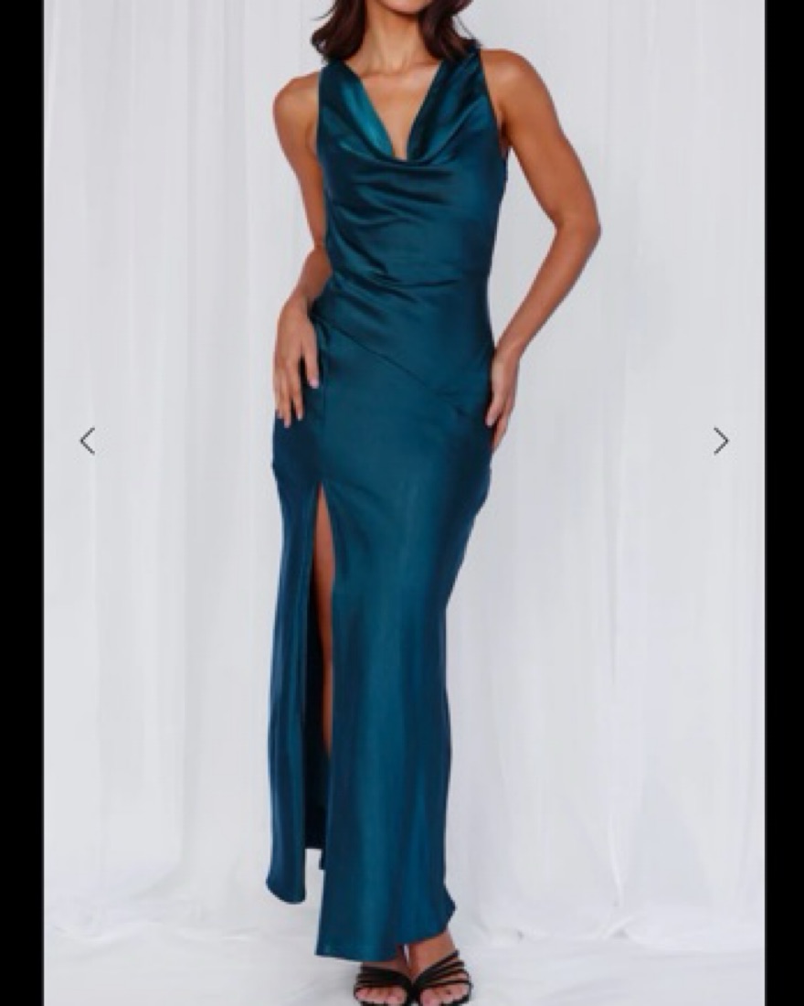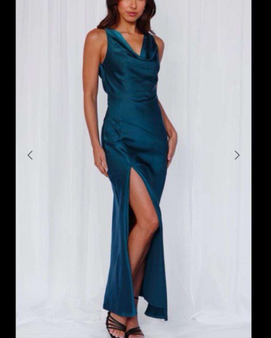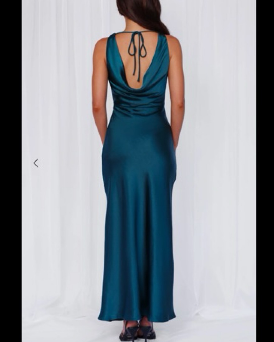 THE LORETTA COWL SATIN MAXI DRESS TEAL Luxurious satin.