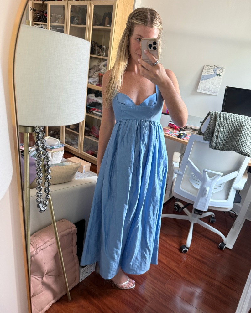 Acler sandgate sleeveless A line midi dress in size 6. Color is blueberry. I am 5’5 so I got this hemmed to hit at the top of my ankle like the model. I’m a size 4 but you can see this dress can fit 4-6 well. Open tie back. Purchased at Anthro. Worn once. Rental Price includes dry cleaning cost