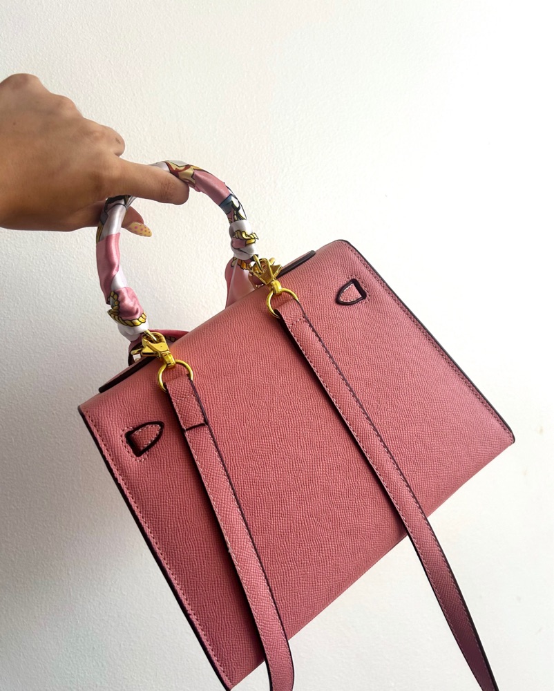 Super cute pink Hermes mini kelly bag with removable chain accessory, strap, and twilly.