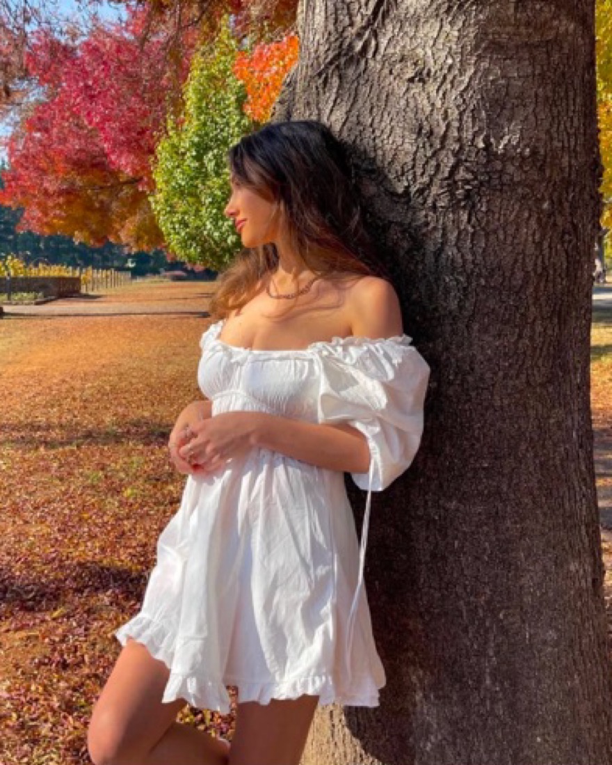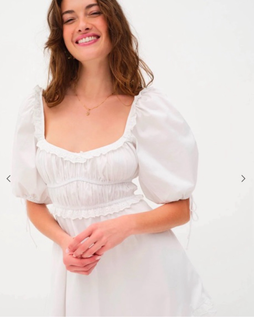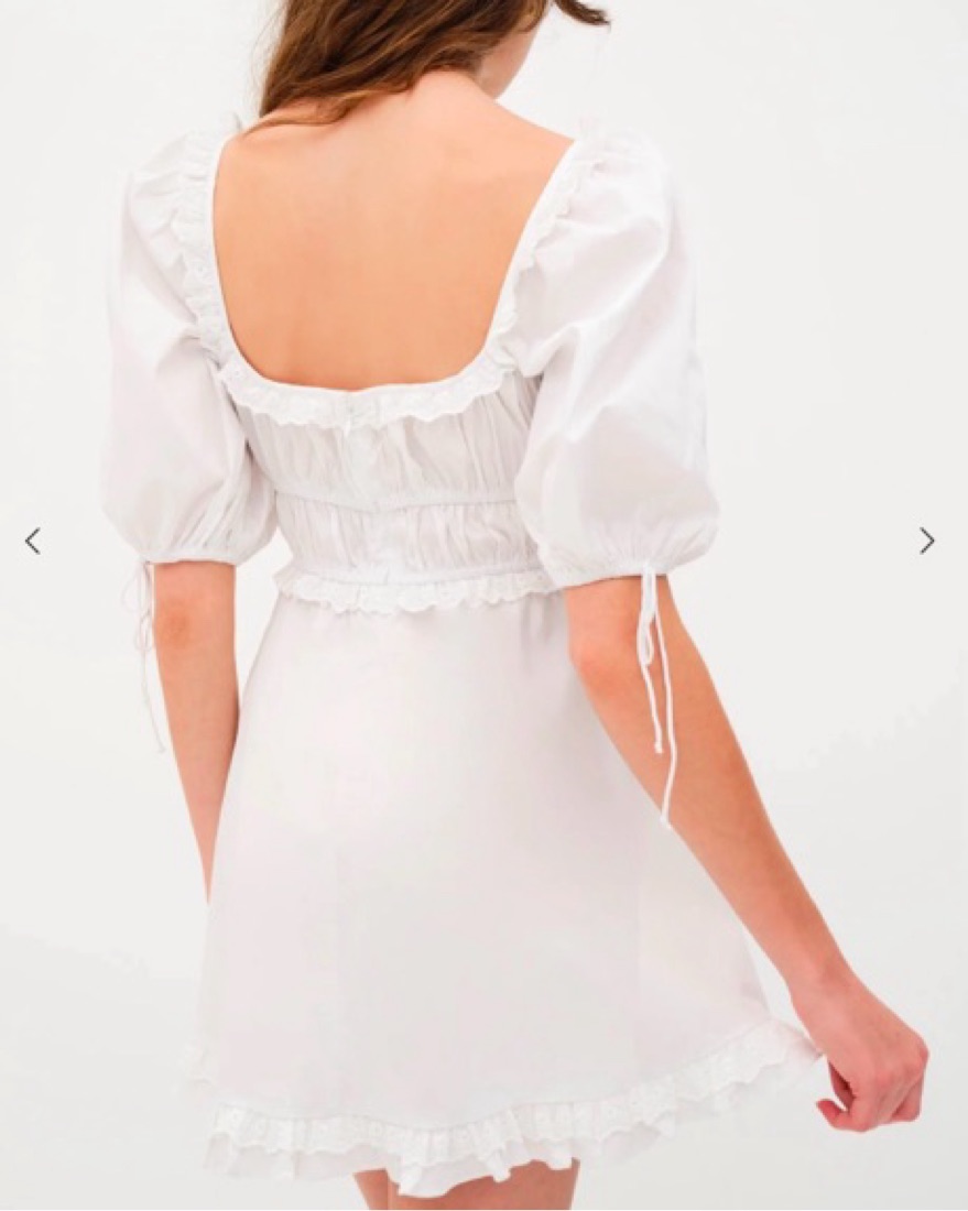 This For Love & Lemons chic puff sleeve dress can be worn off-the-shoulder for a summer garden party or outdoor brunch. The flowy silhouette and puff sleeves add a romantic touch. #puff sleeve, mini dress, for love and lemons, for love & lemons, Jackson mini dress, white dress