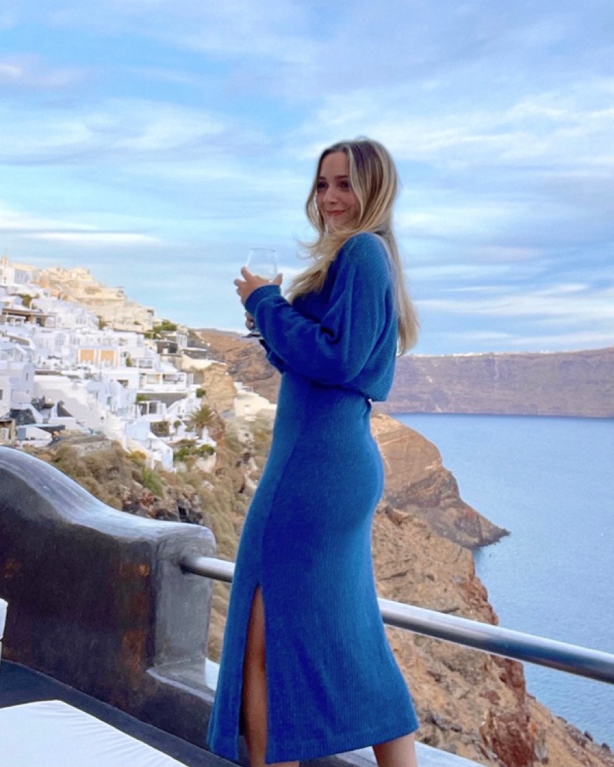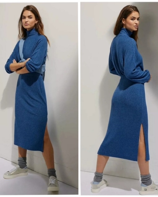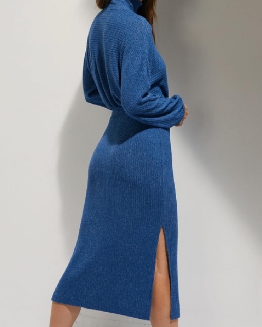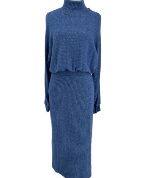 This midi dress gas an elasticized waist. It also has side slits and a high neck style. So comfortable!