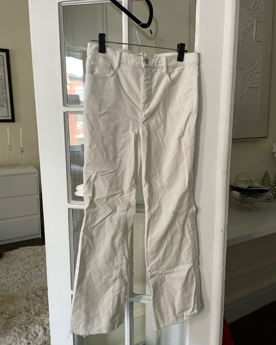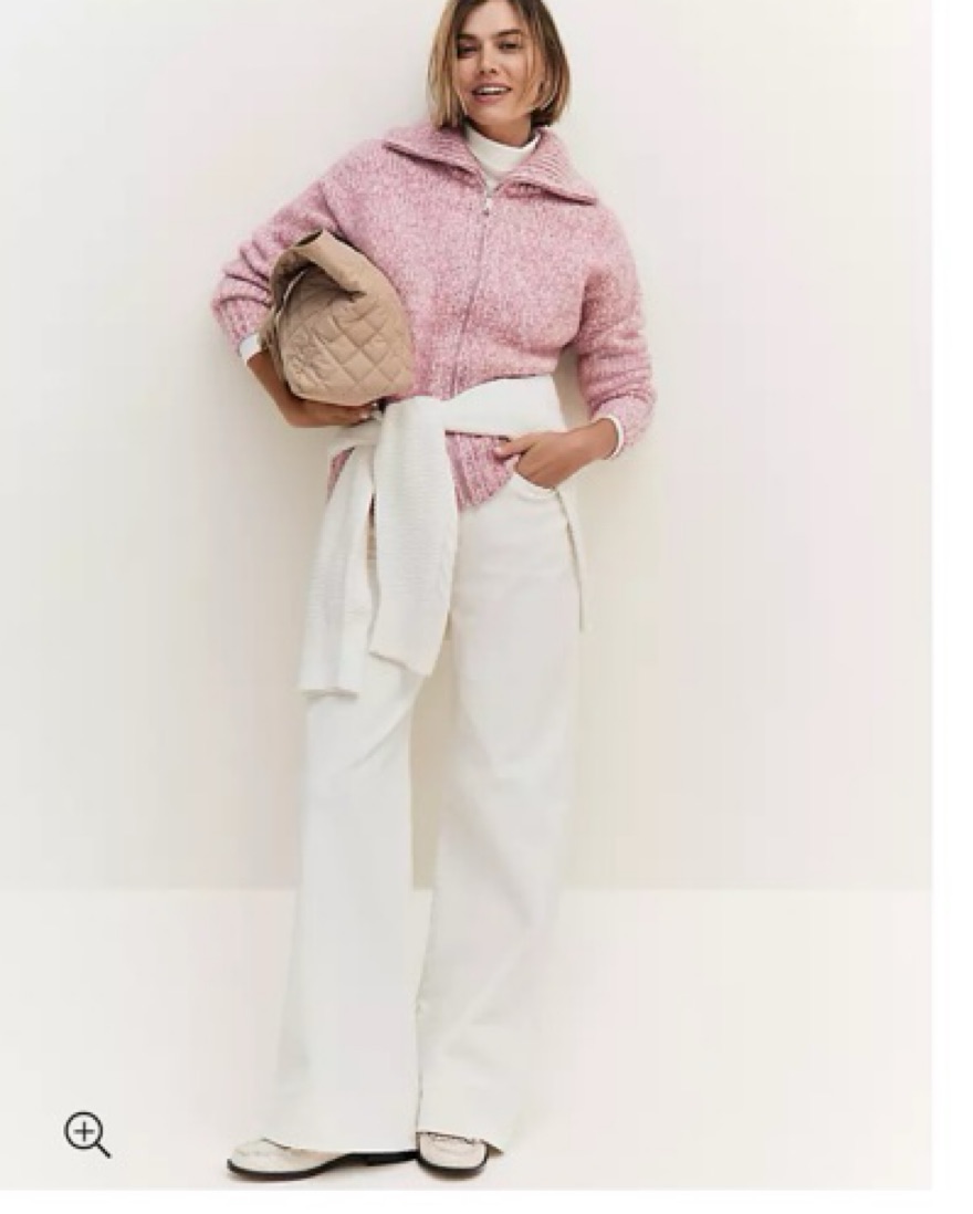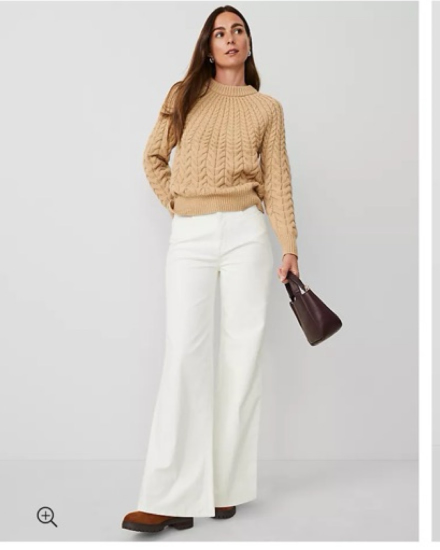 This chic and comfortable ensemble is perfect for a relaxed winter day. Pair the warm, textured sweater with the sleek white pants for a polished yet effortless look. Un hemmed bottoms