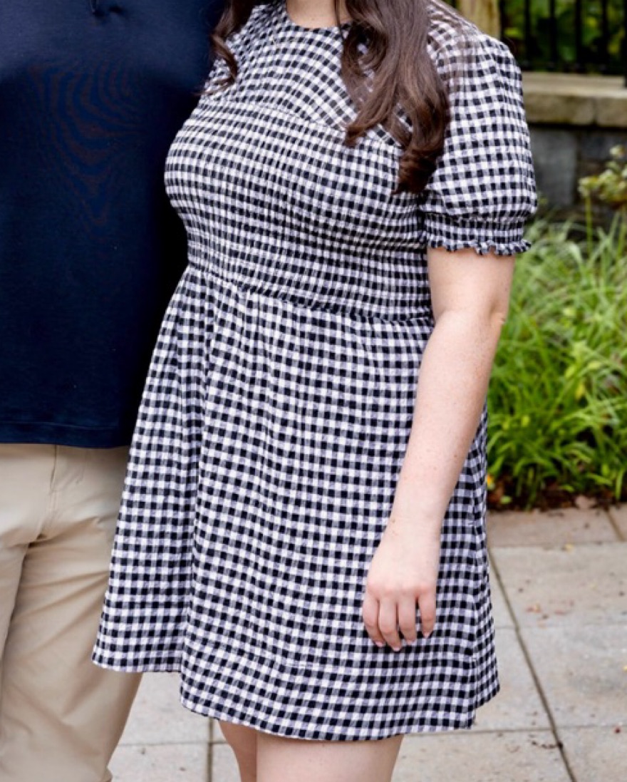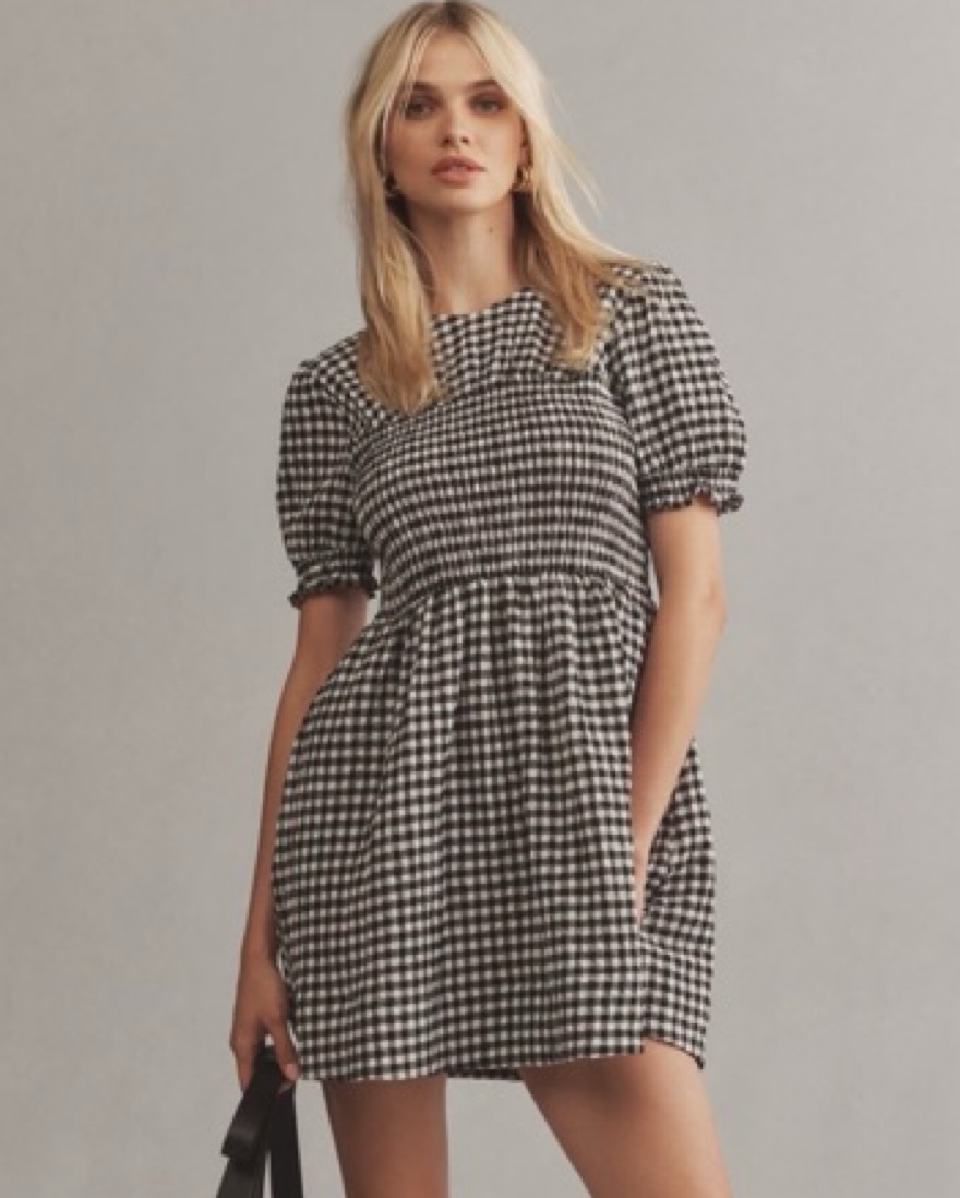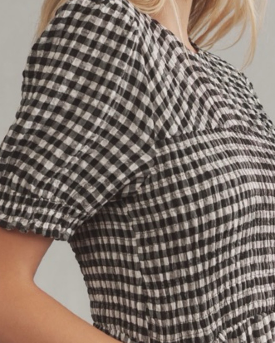 Versatile gingham dress with puff sleeves and smocking detail. Perfect for holiday parties. Worn once