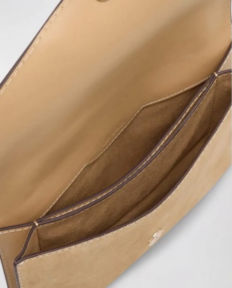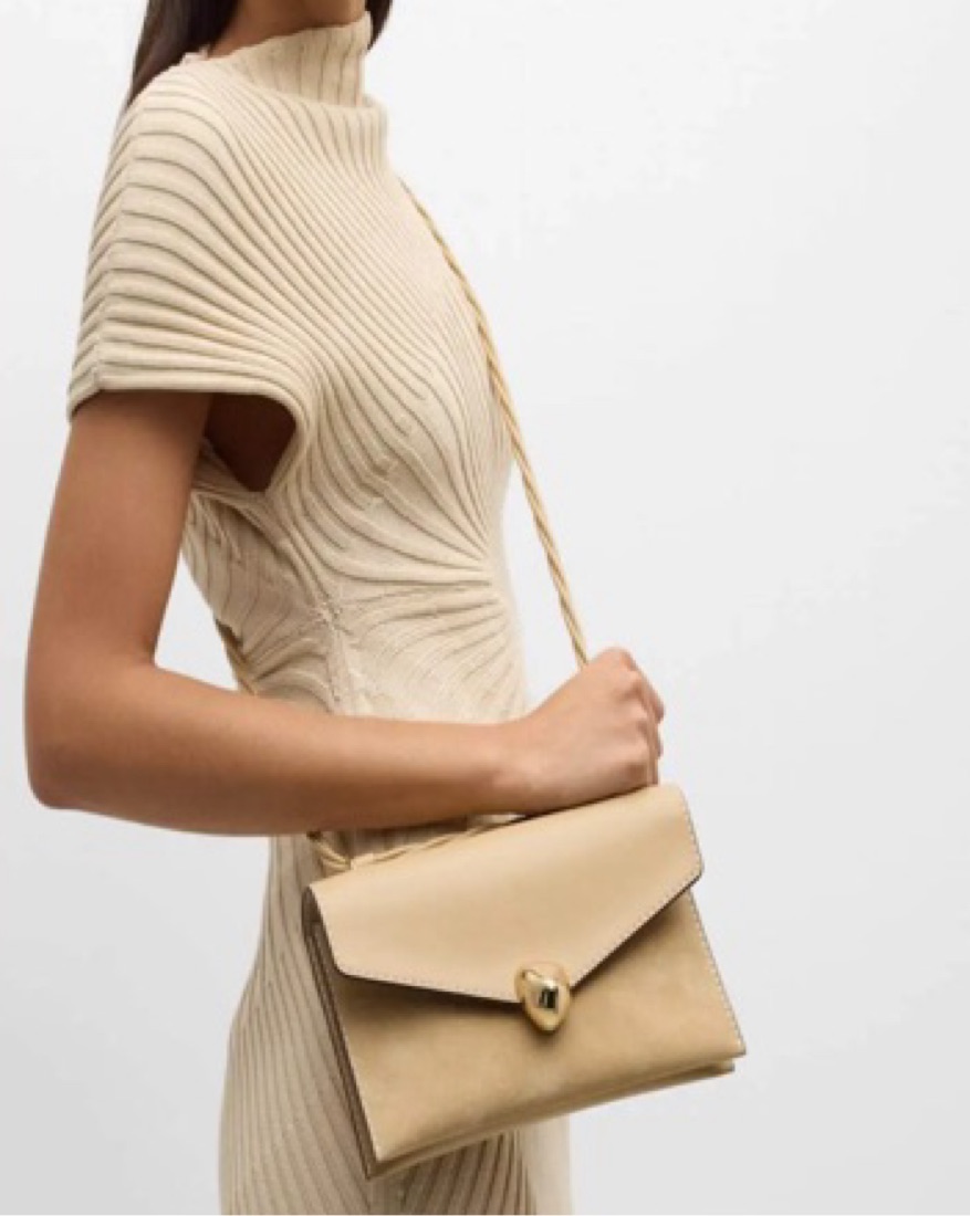 The Cult Gaia "Renee" crossbody bag is crafted from suede and leather. It features a sliding crossbody strap that can be worn on the shoulder or crossbody. The envelope flap top secures with a snap closure. The interior features one slip pocket. It is lined with nylon and polyurethane.