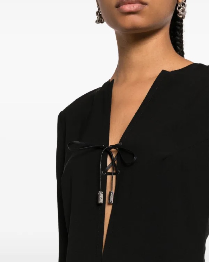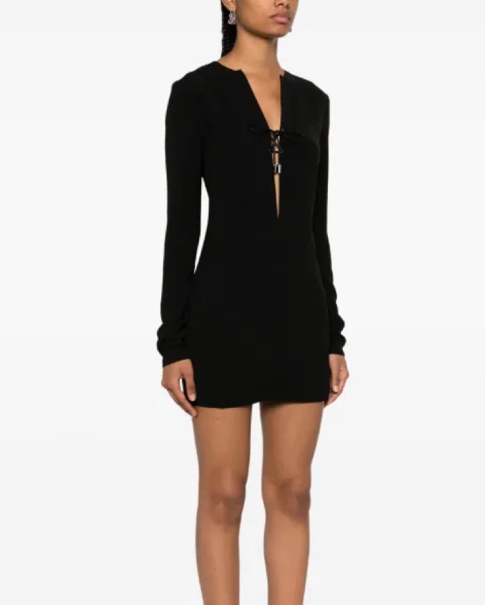 Lace up mini dress with deep V and leather ties. Long sleeves. Pair with some sandals and a headscarf for a cooler summer night.