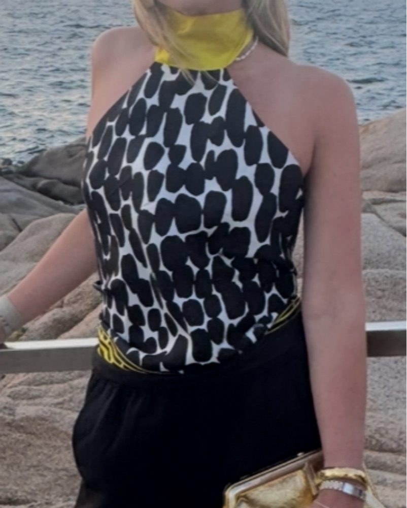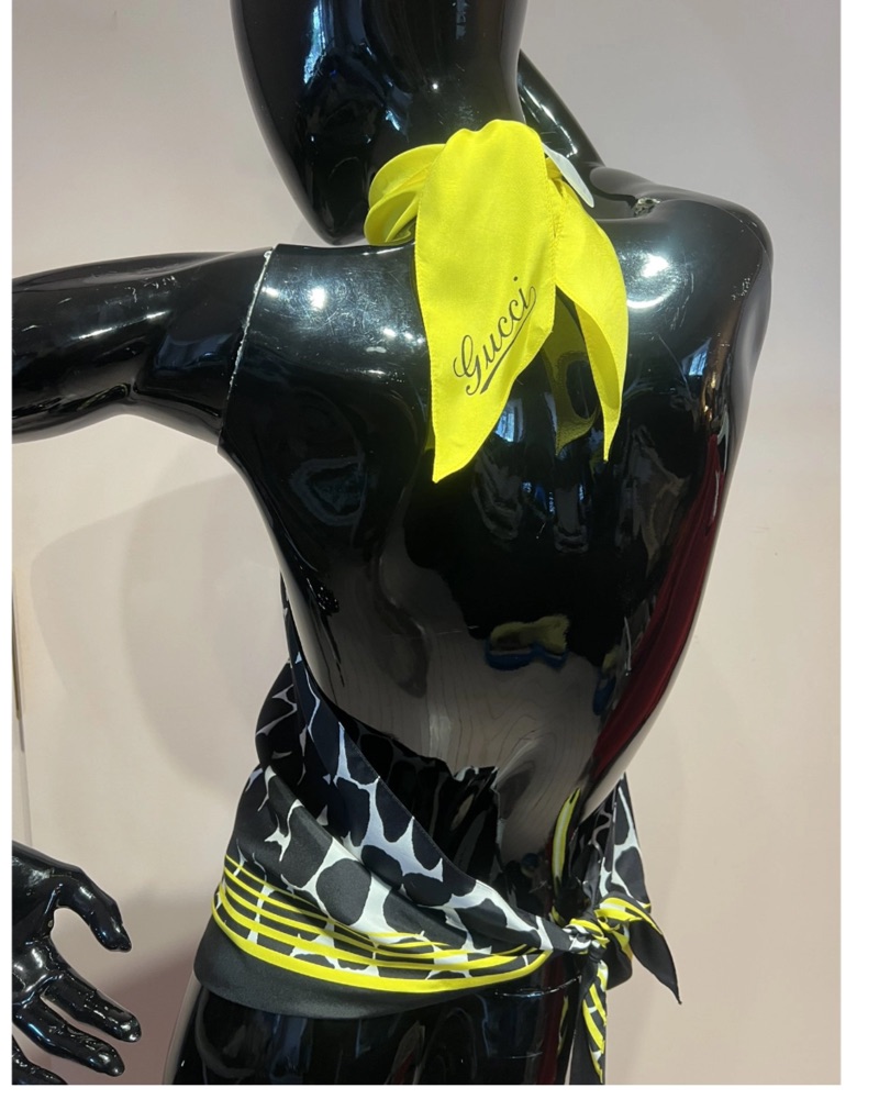 Gucci scarf halter top back tie- one size. Immerse in the allure of the Gucci scarf top, a timeless piece exuding refined charm. Crafted from luxurious silk, it features a vibrant print, halter neck design, and adjustable back tie, epitomizing effortless style and grace for any occasion.