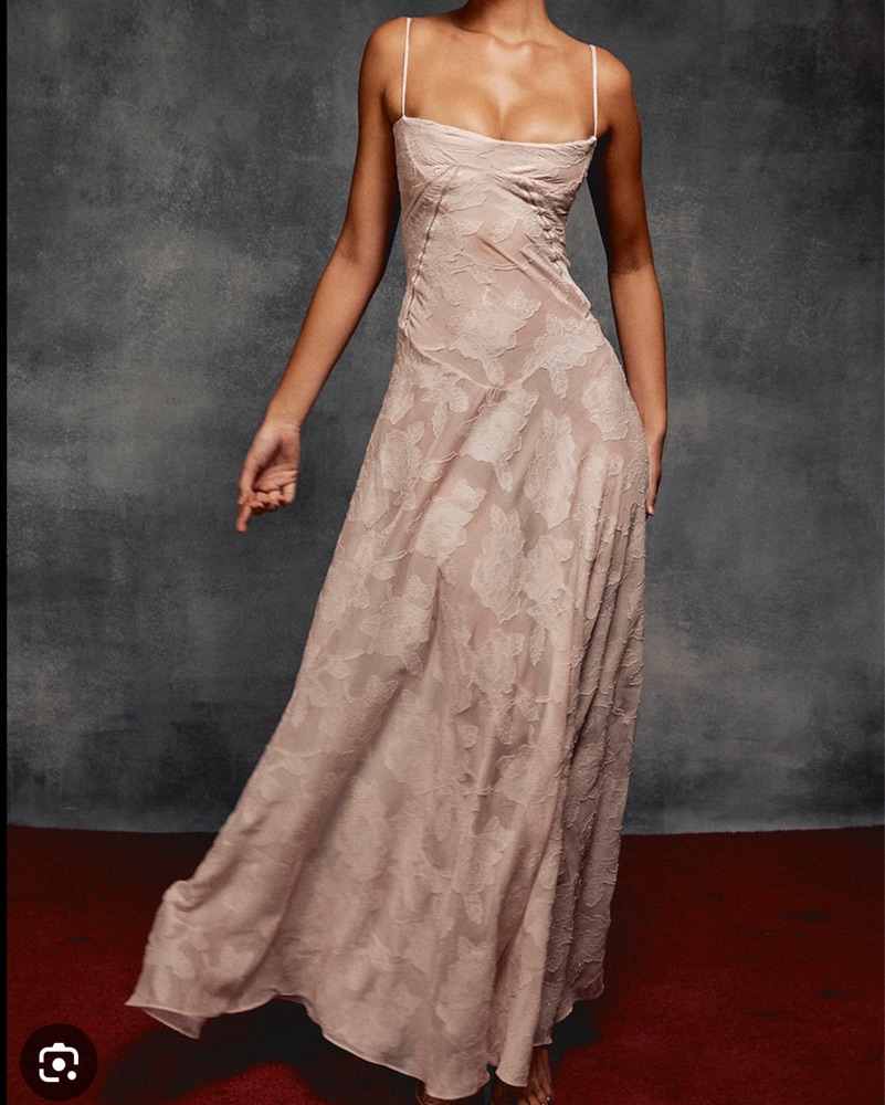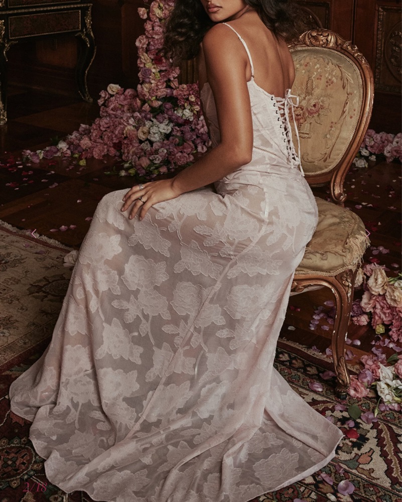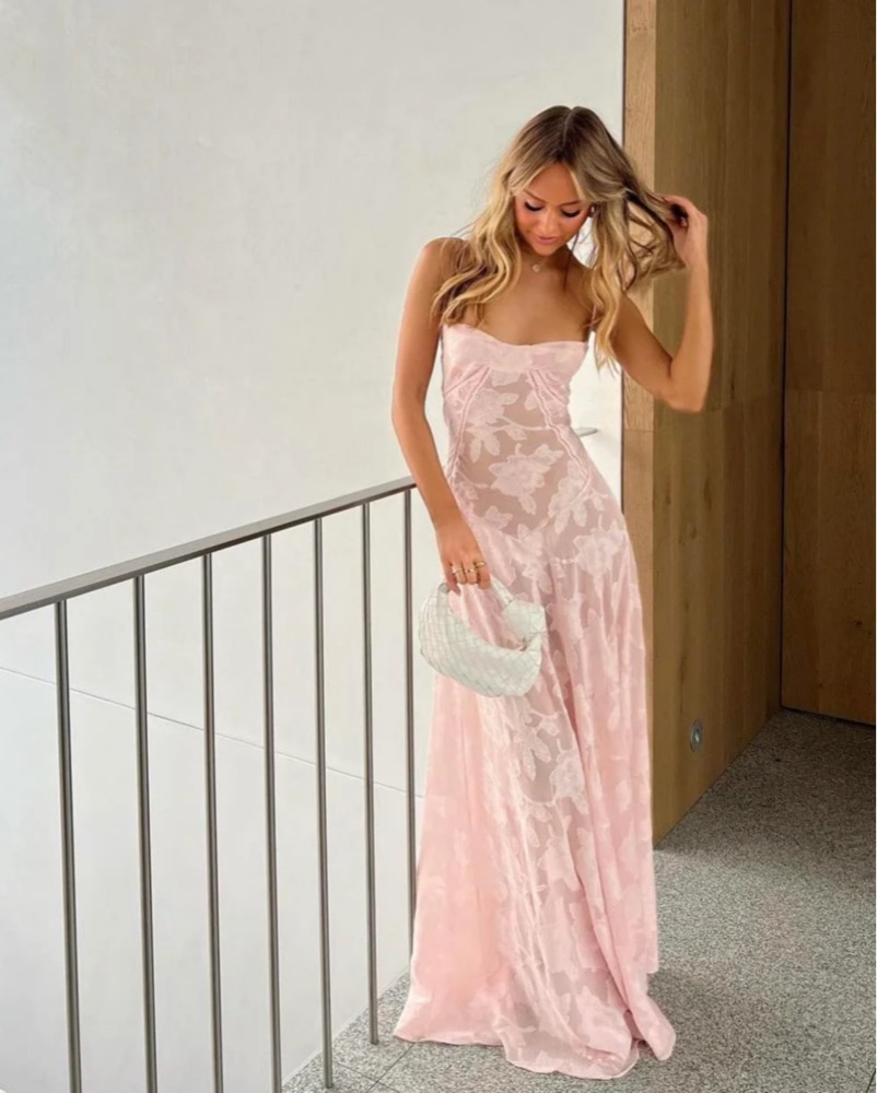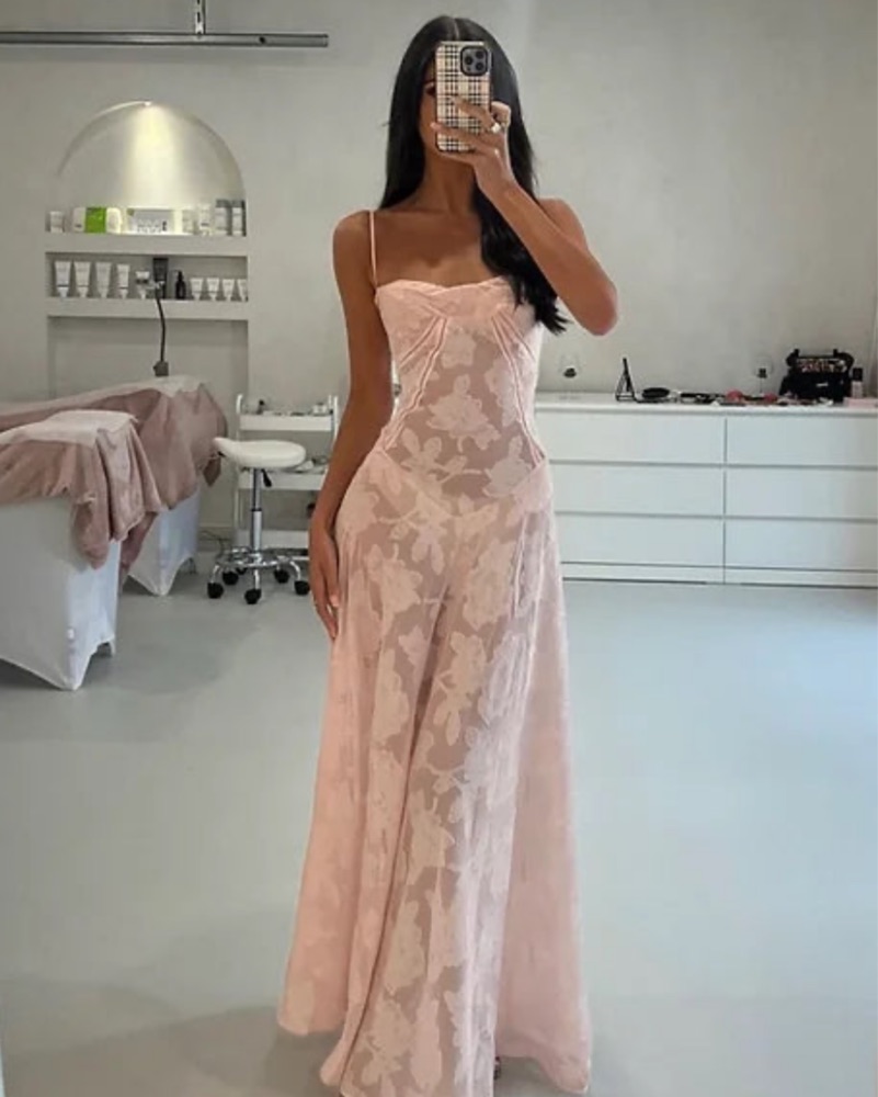 Very feminine & romantic. Sheer, soft pink, floral lace dress. Curved hem at the waistline & built-in bra, make it a super flattering dress!