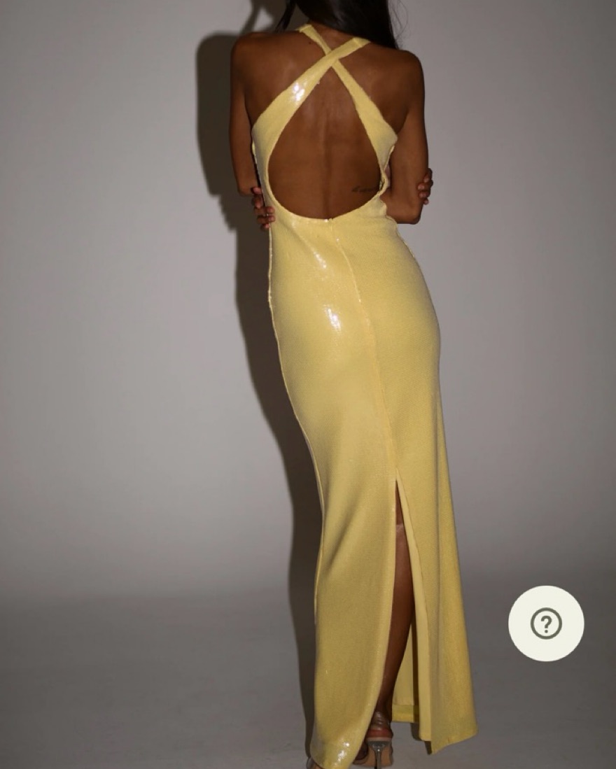 Elevate your night out in this stunning sequin halter dress. The bold yellow hue and elegant halter neckline create an unforgettable look perfect for a glamorous event.