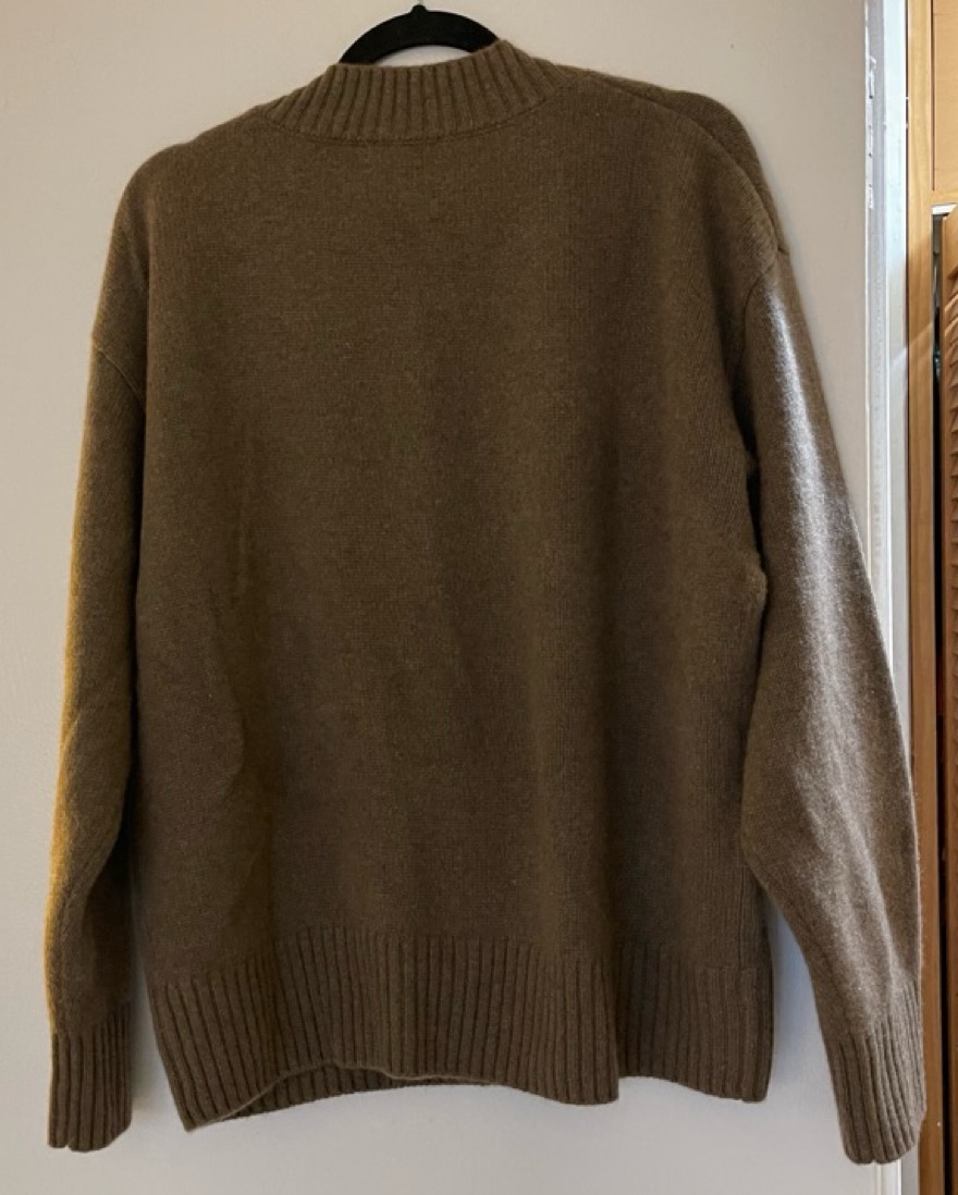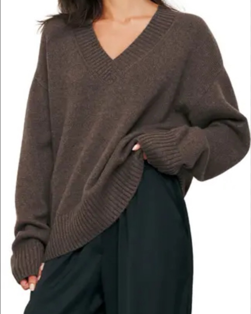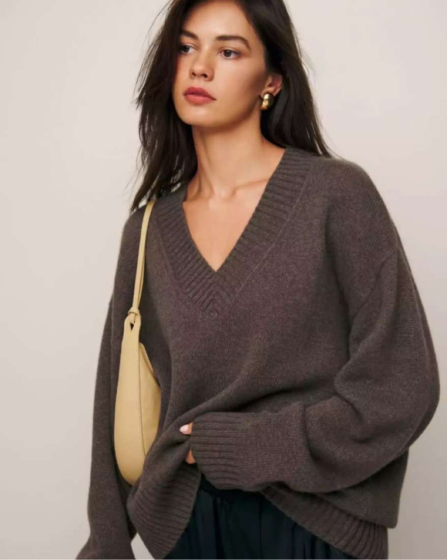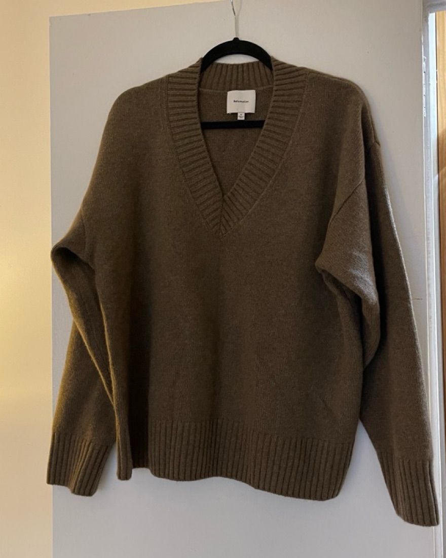 Reformation jadey oversize cashmere sweater. A blend of recycled cashmere and virgin cashmere adds a luxuriously soft feel to this oversized, layerable V-neck sweater trimmed with cozy ribbing. Color: dachshund. Please dry clean after rental!