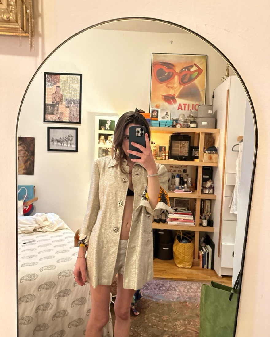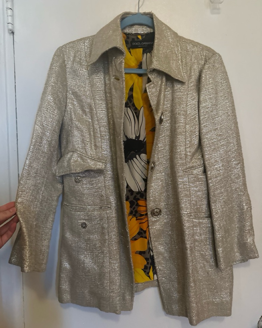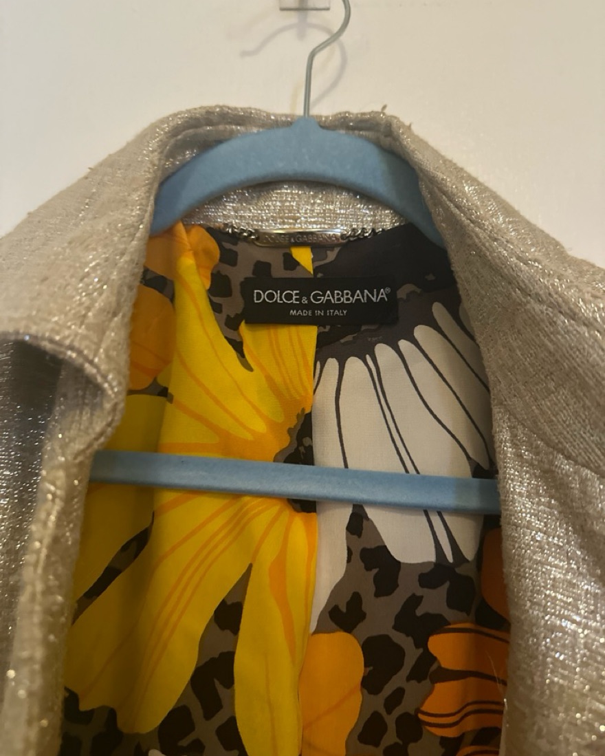 Dolce + Gabbana gold metallic jacket with floral lining.