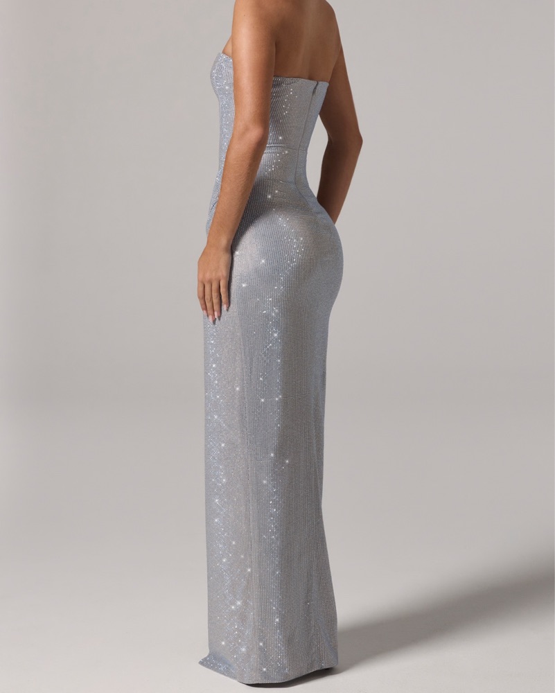SILVER SIZE 2 US 6 UK. Designed in a figure-hugging maxi silhouette with an alluring thigh-high split made to make an entrance, it’s pure after-dark glamour. Straps available if preferred, true to size so if you’re in between sizes, I’d recommend sizing up and looking for a 4 US.