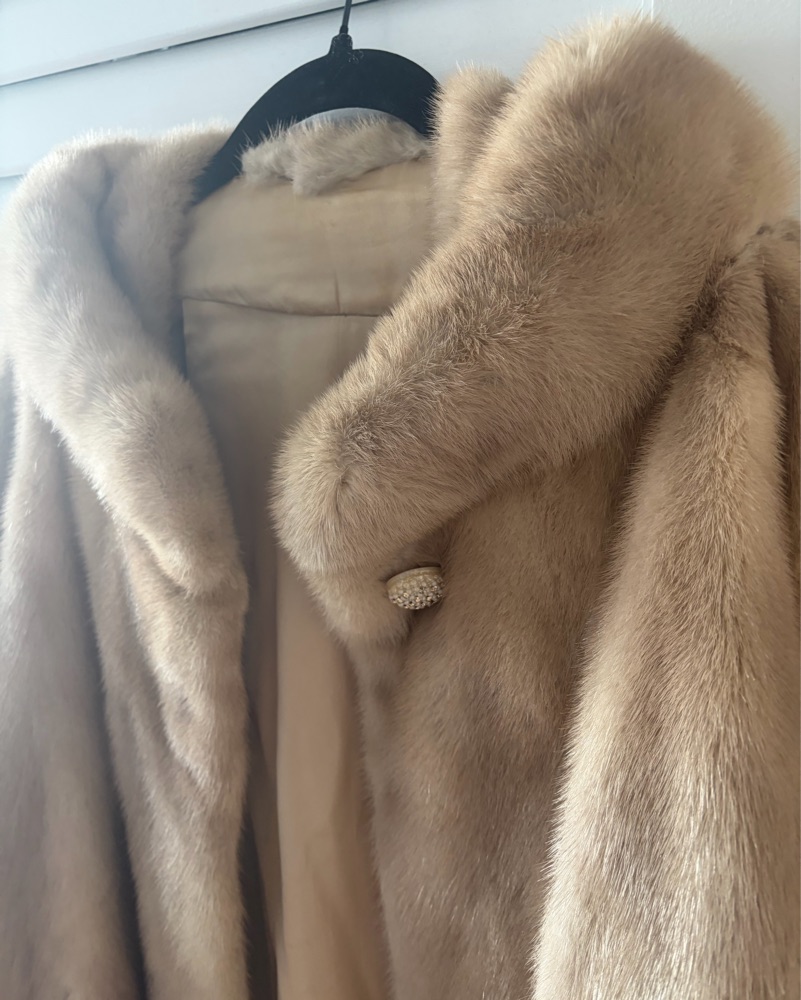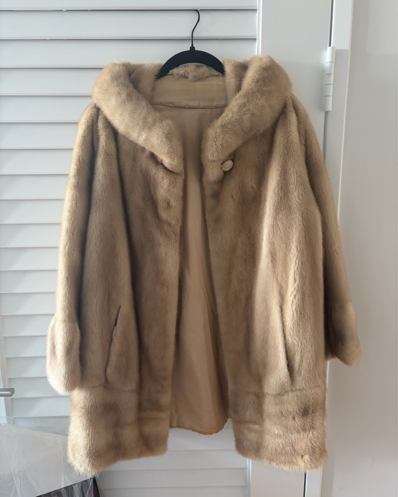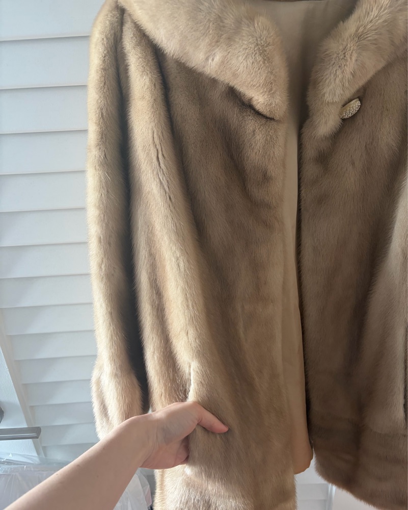 Gorgeous real fur, vintage coat. Blonde / light brown in color. Excellent condition, only a few minor stains in the silk interior (see picture)- you cannot see this when wearing the coat. Very warm! It’s oversized - maybe size 10. I’m usually a size 4 and love the fit. No smell, dry cleaned