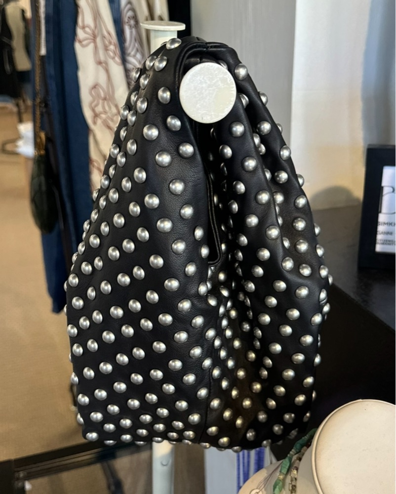 This striking leather hobo bag is perfect for adding an edge to any outfit. The studded design makes it a bold statement piece.