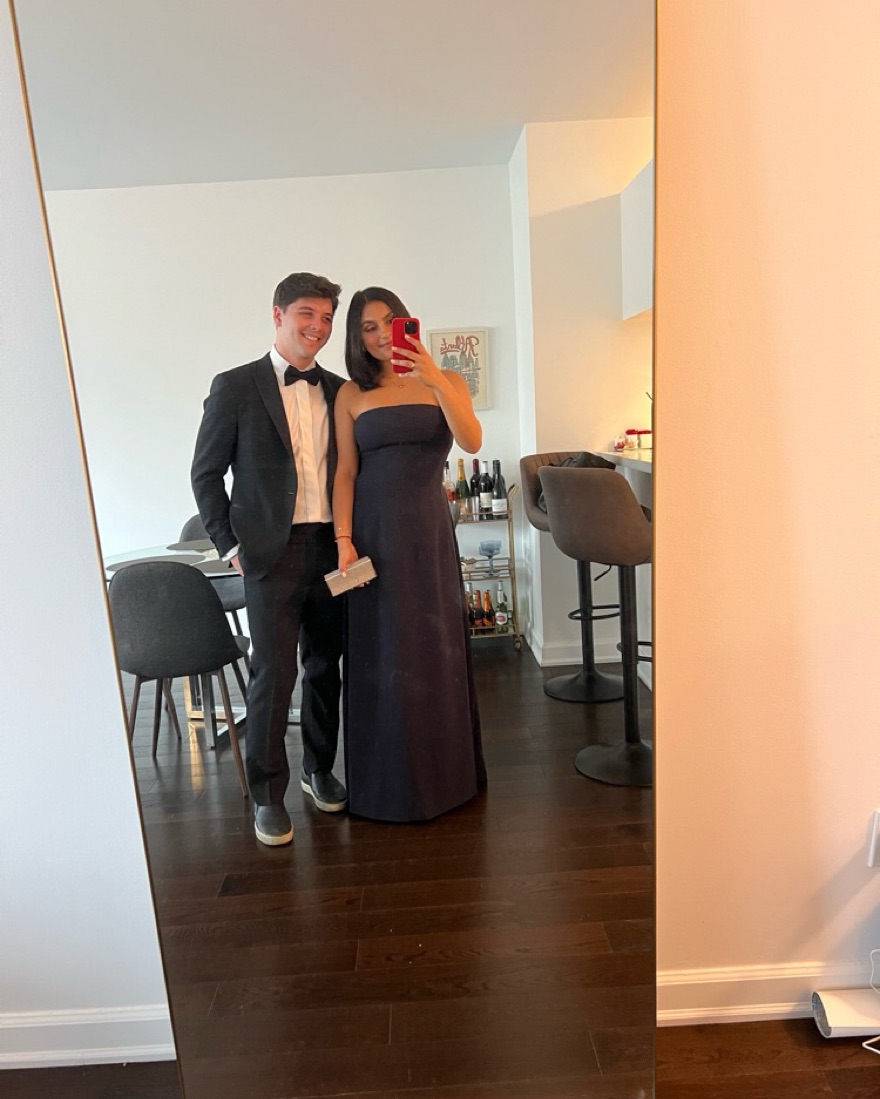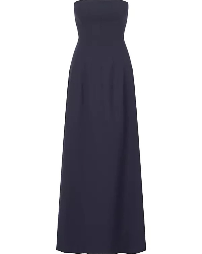 Navy blue strapless, hemmed to hit floor with 3-4inch heels (5’2)