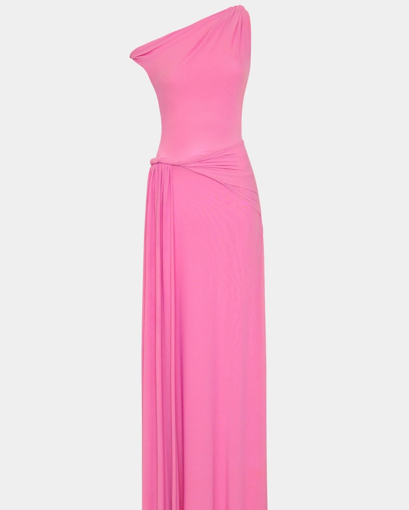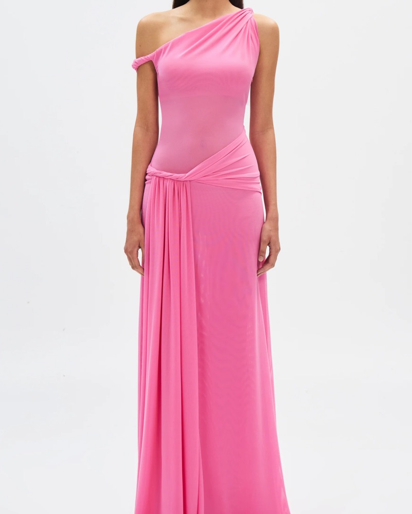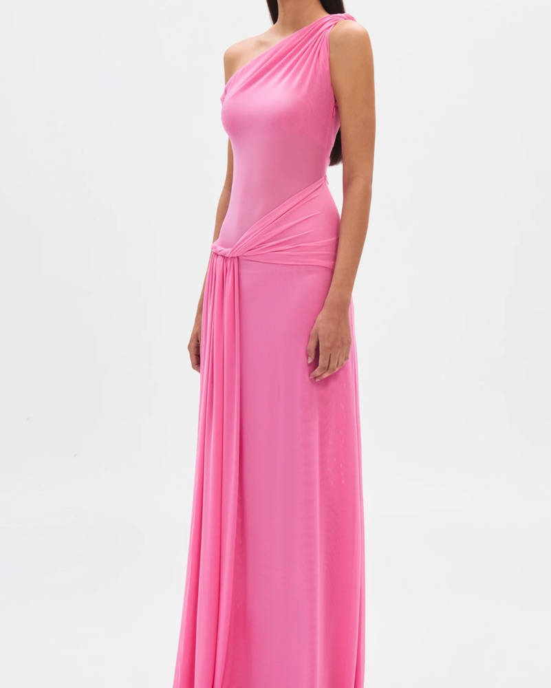 The 'Sisal' Mesh Maxi Dress in Orchid Pink is a new style from MISHA featuring an asymmetrical design. Her waterfall sash detail at the hip elongates the body, creating strong vertical lines. Great for a wedding or special event!