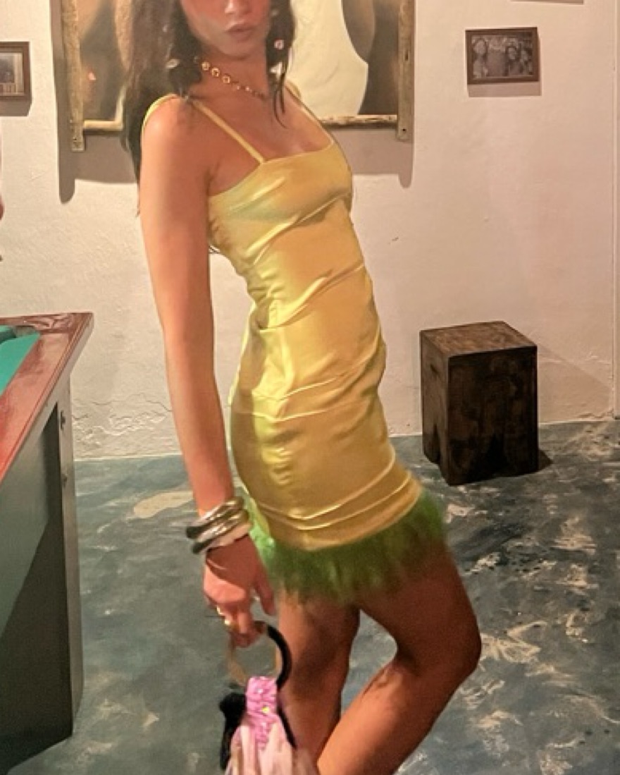 Light green tight mini dress with little subtle feathers on the bottom and rhinestones, very cute and fits well on body