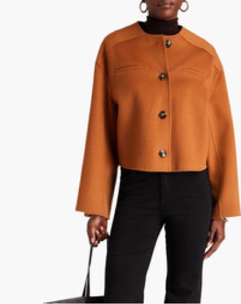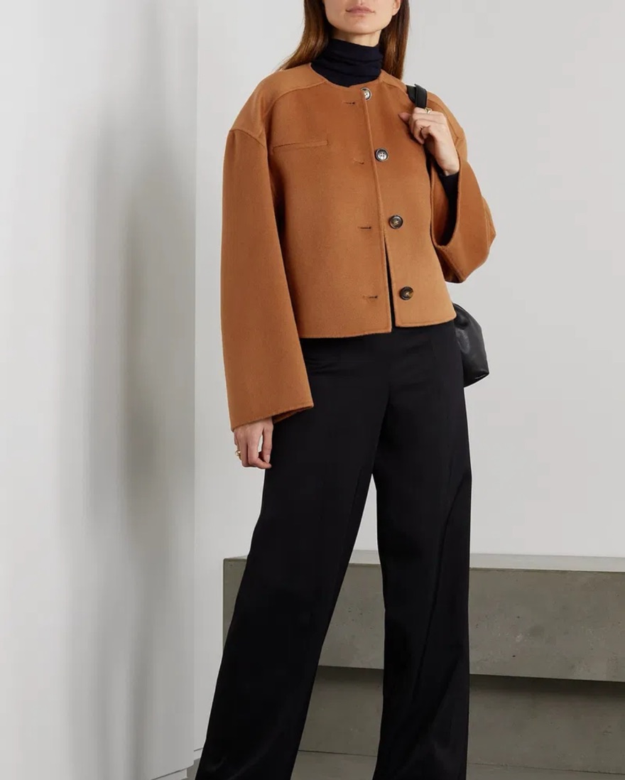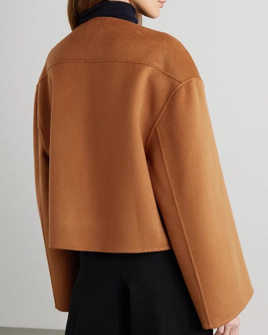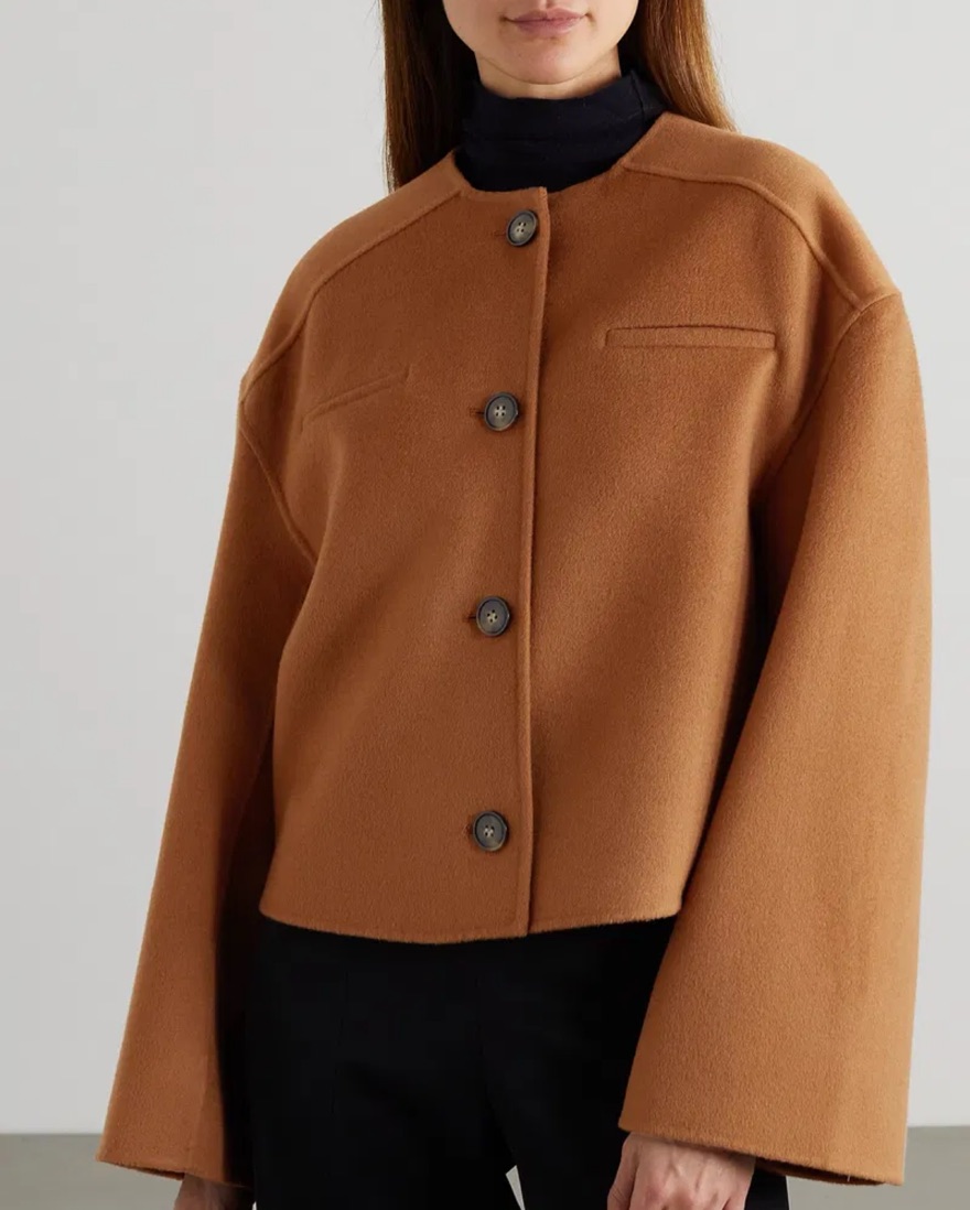 Loulou Studio jacket in hazelnut, tailored from a blend of wool and cashmere yarns chosen for their exceptional quality and has a cocoon shape that's so evocative of styles from the '60s.
