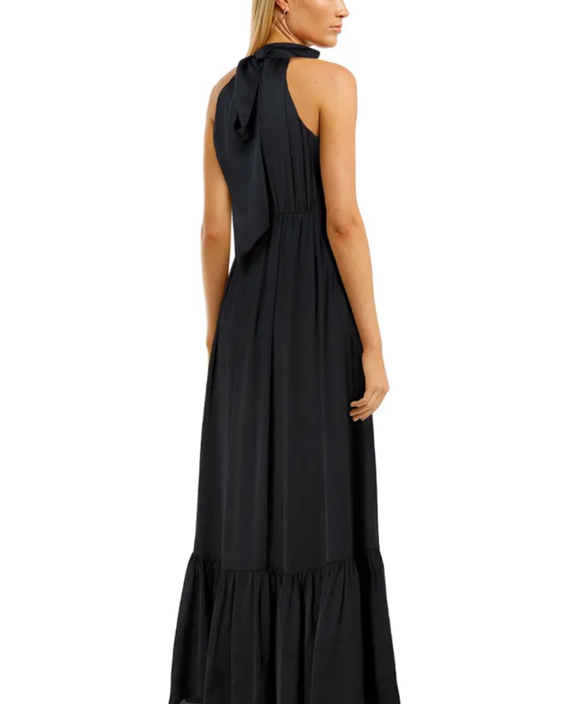 Luxurious and flowy, this sleek black silk maxi dress with tie halter neck is perfect for a formal event or special occasion.