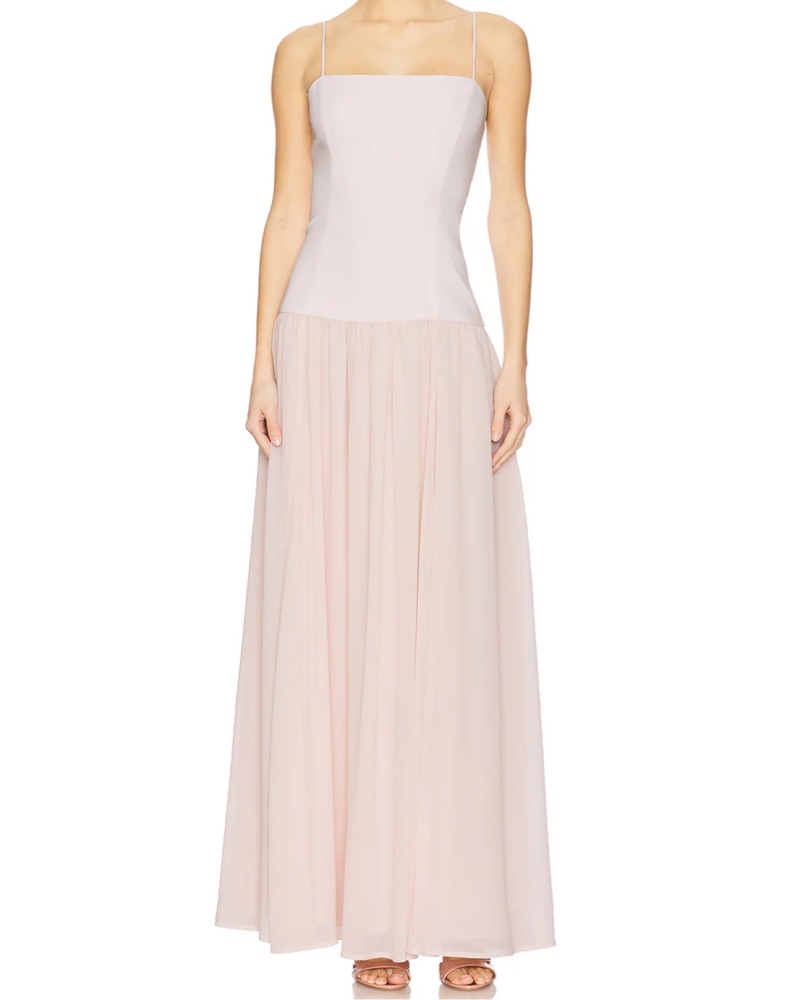 This sophisticated blush gown features a flattering sweetheart neckline and a flowing, floor-length skirt perfect for an evening event or formal occasion.