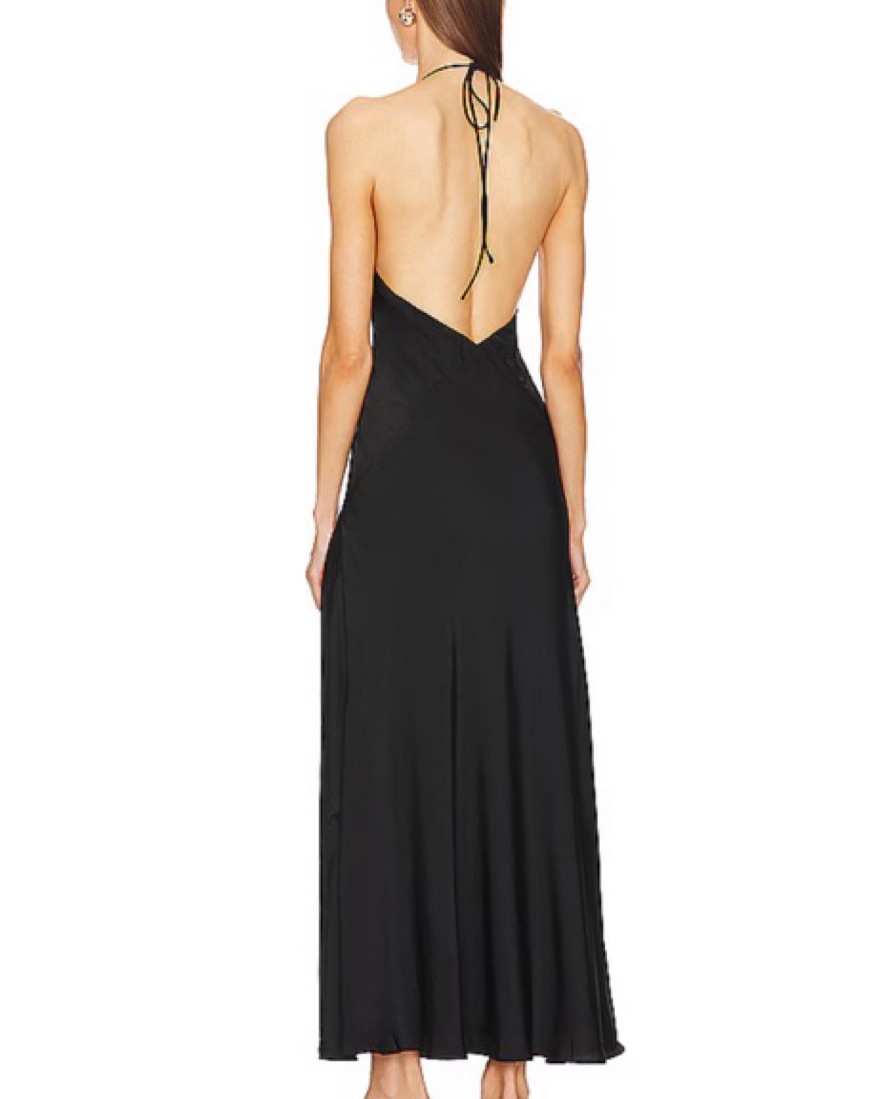chic dress with a halter tie top and open back with a slit. great for a formal event or wedding. worn once. please dry clean after wearing