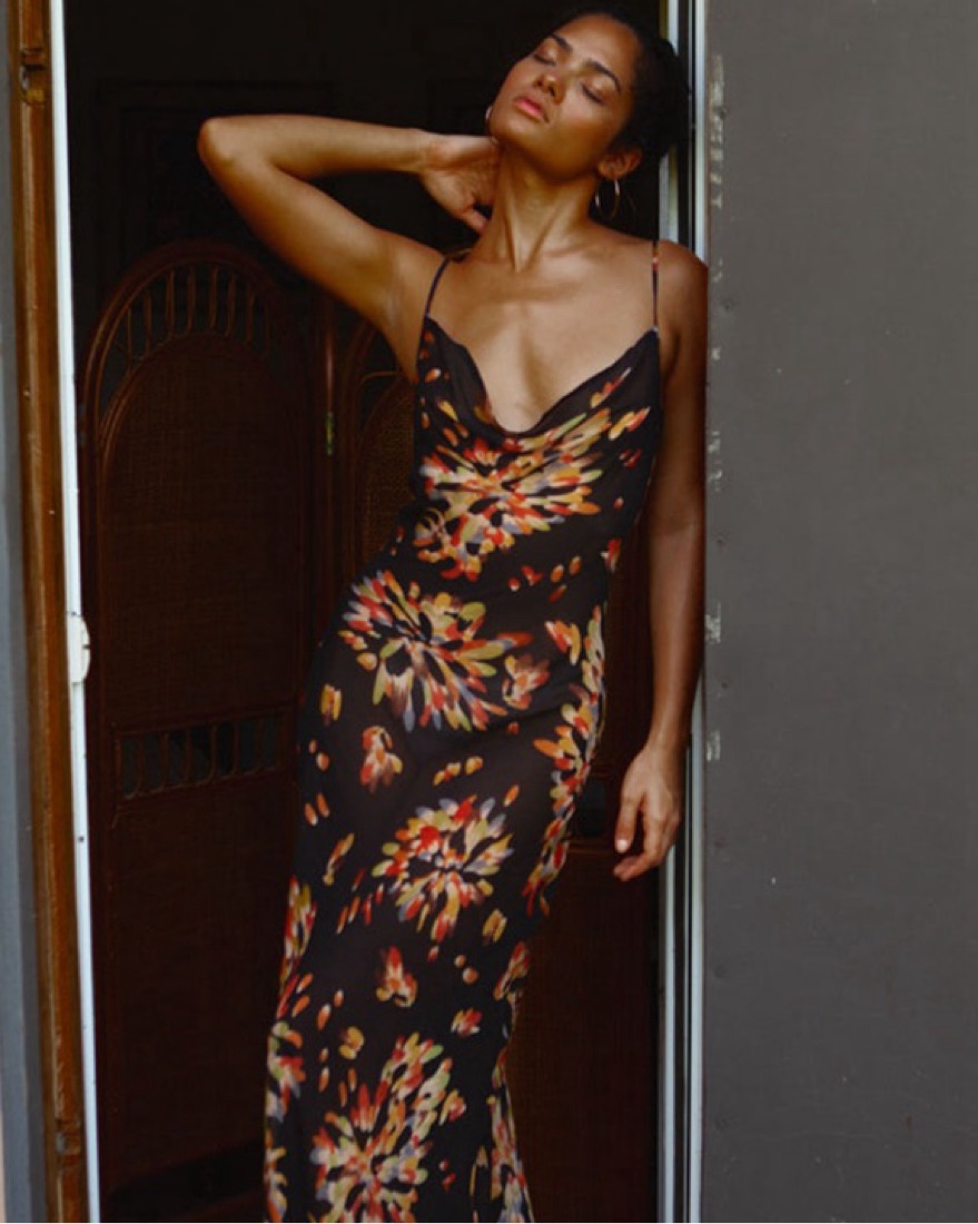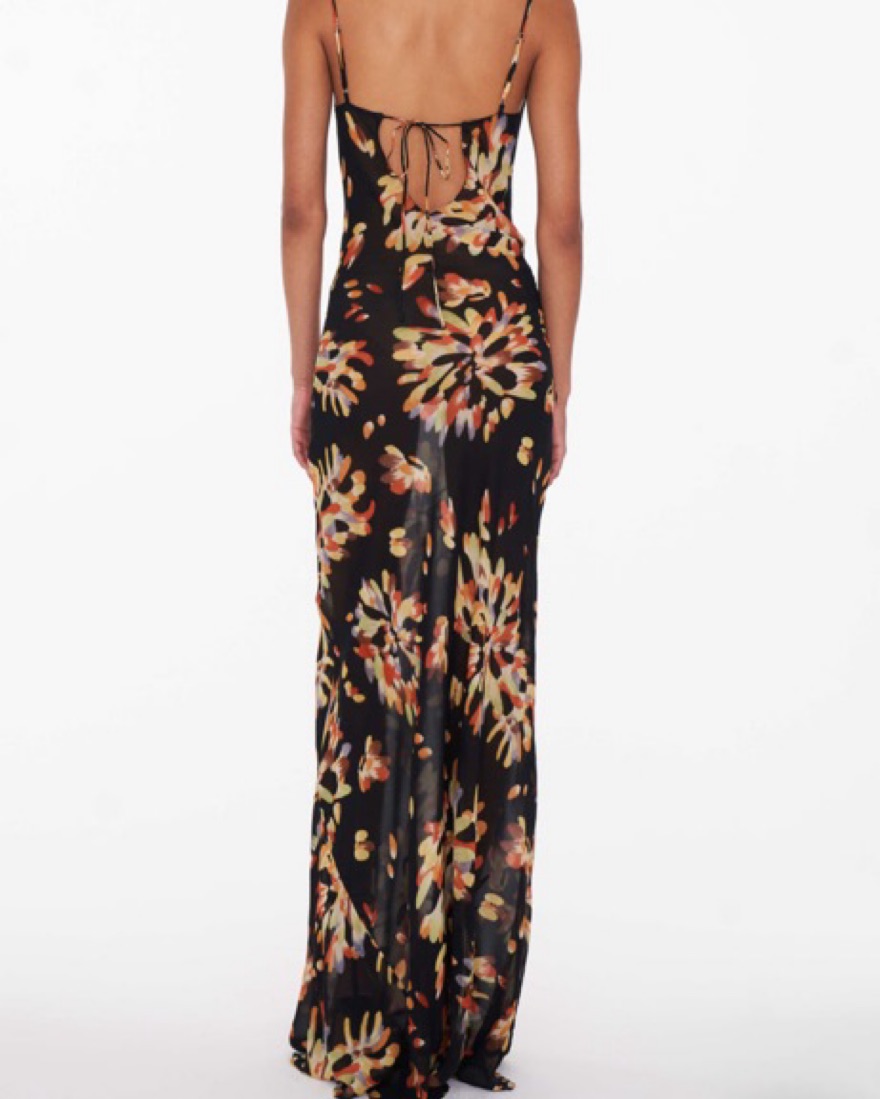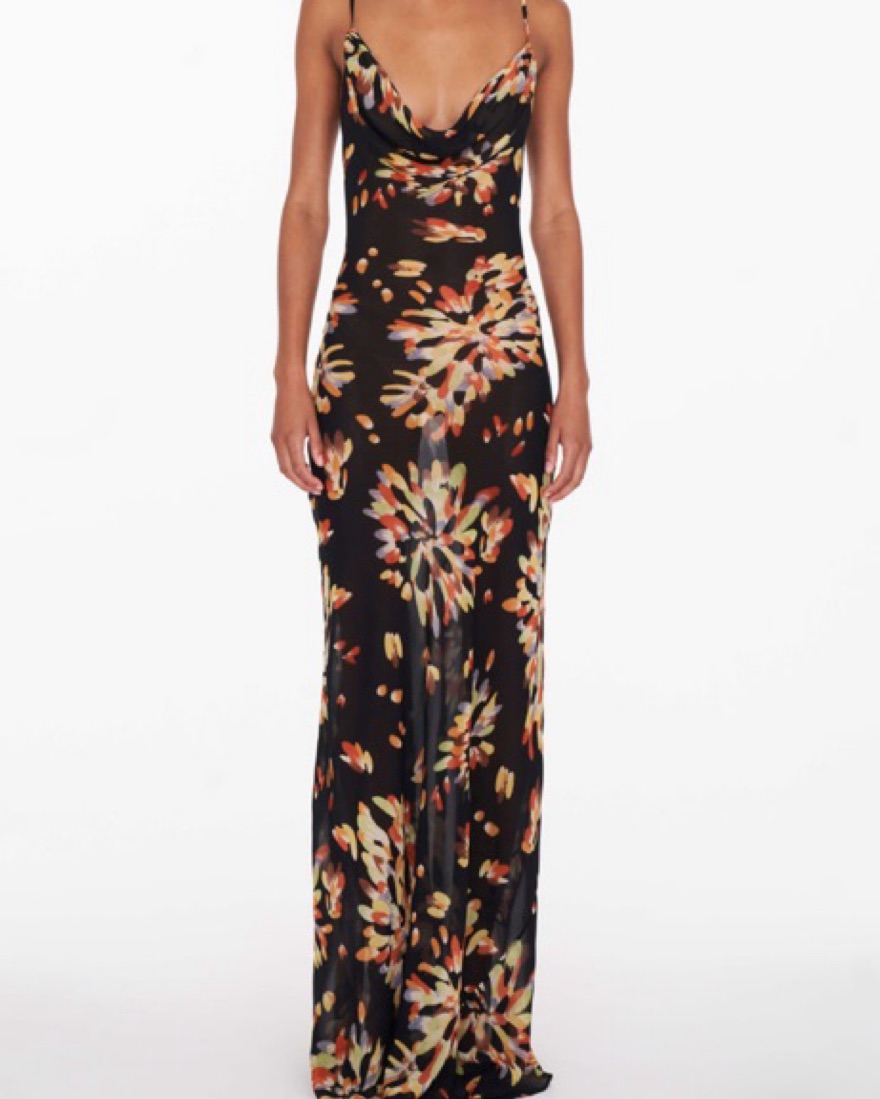 Cowl neckline Open back detail Adjustable straps Maxi length Slightly sheer