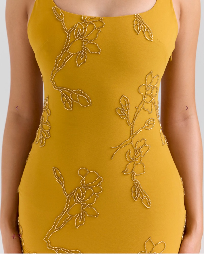 Marigold colored hand-beaded georgette with adjustable straps, and lace-up back, and a softly pleated flowing skirt. Perfect for weddings, galas, or destination evenings. In pristine condition and ready to wear. Worm once.