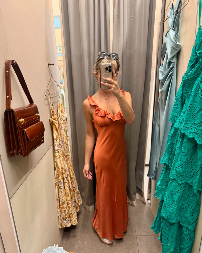 Zoie Dress in Brick ASTR the Label | Worn once for a wedding | Bought new early August | Fabric: Satin (lightweight with beautiful sheen)