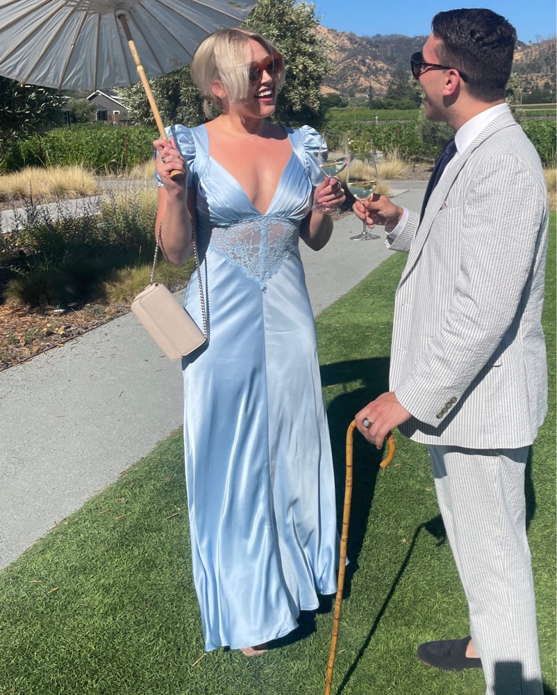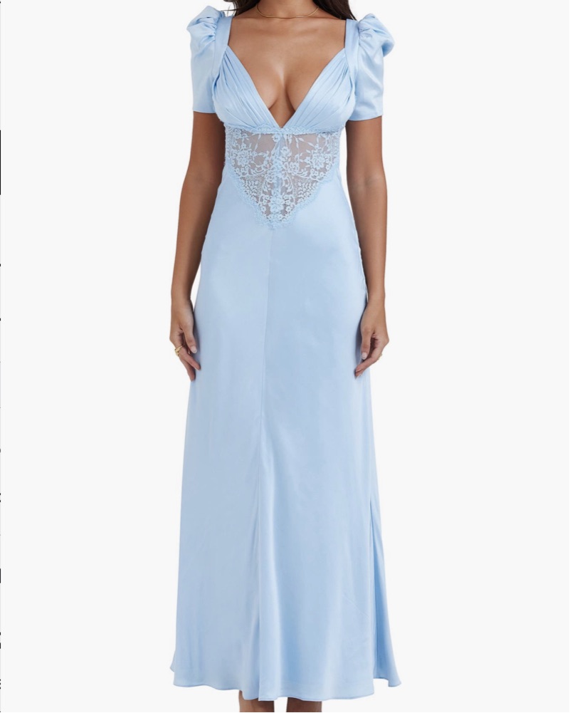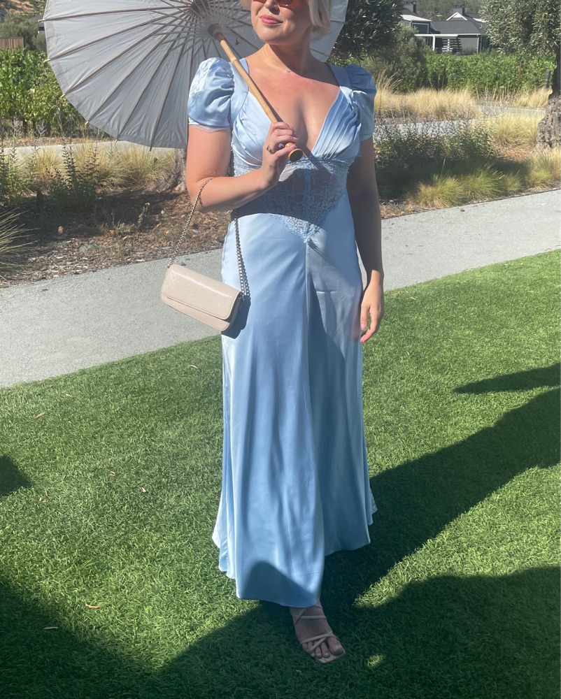House of CB Rafaela dress in light blue (Dutch Canal) . Size Large (A/C cups). This stunning blue satin gown with delicate lace accents is perfect for a formal event or special occasion. Wore to a spring wedding in Napa! The fitted bodice and flowy skirt create a flattering and feminine silhouette.