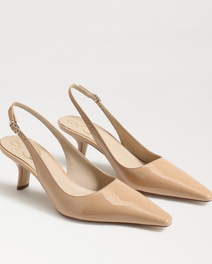 Patent leather slingback pumps. Really comfortable, go with almost everything! Heel height is 2.4 inches